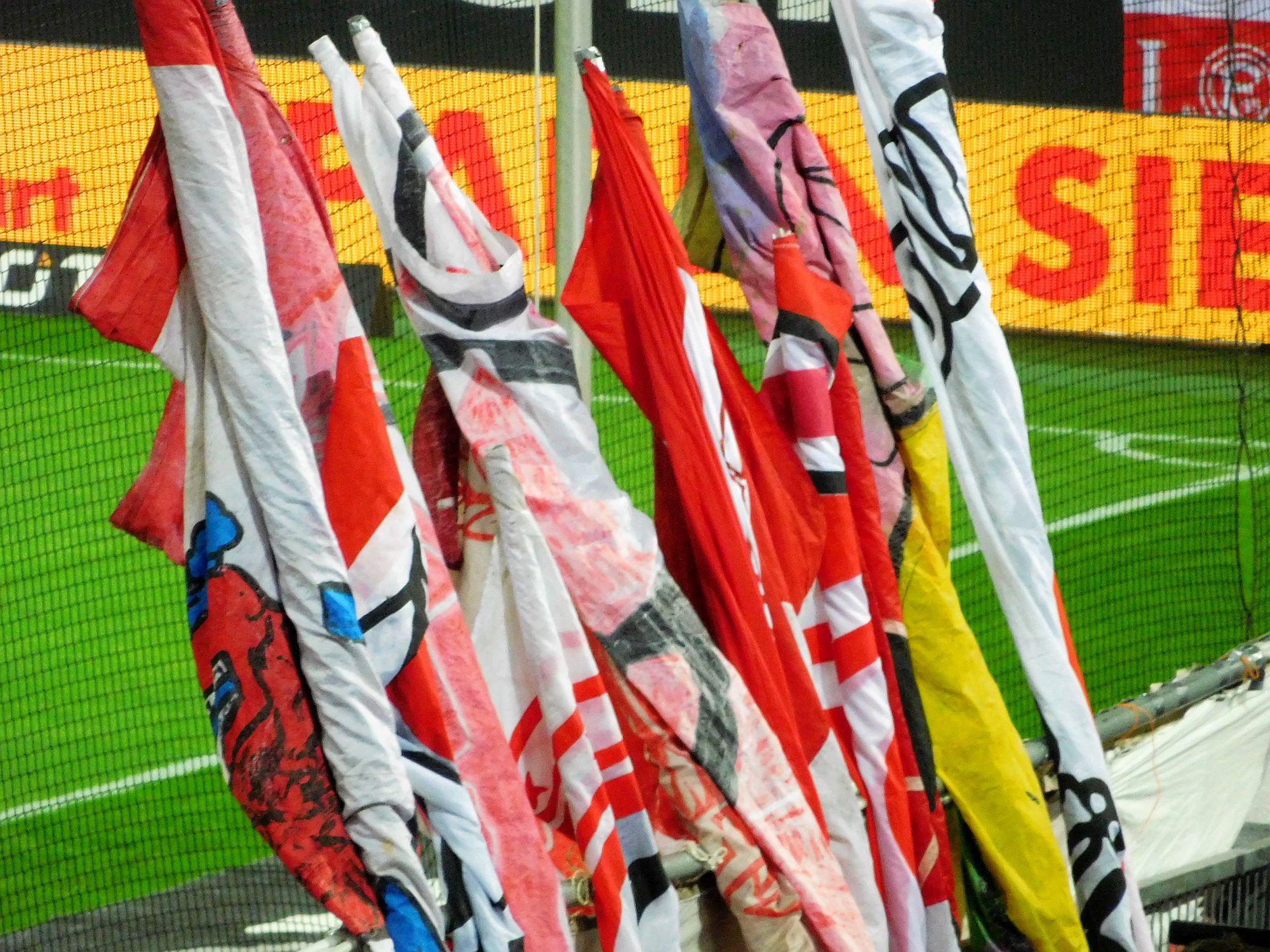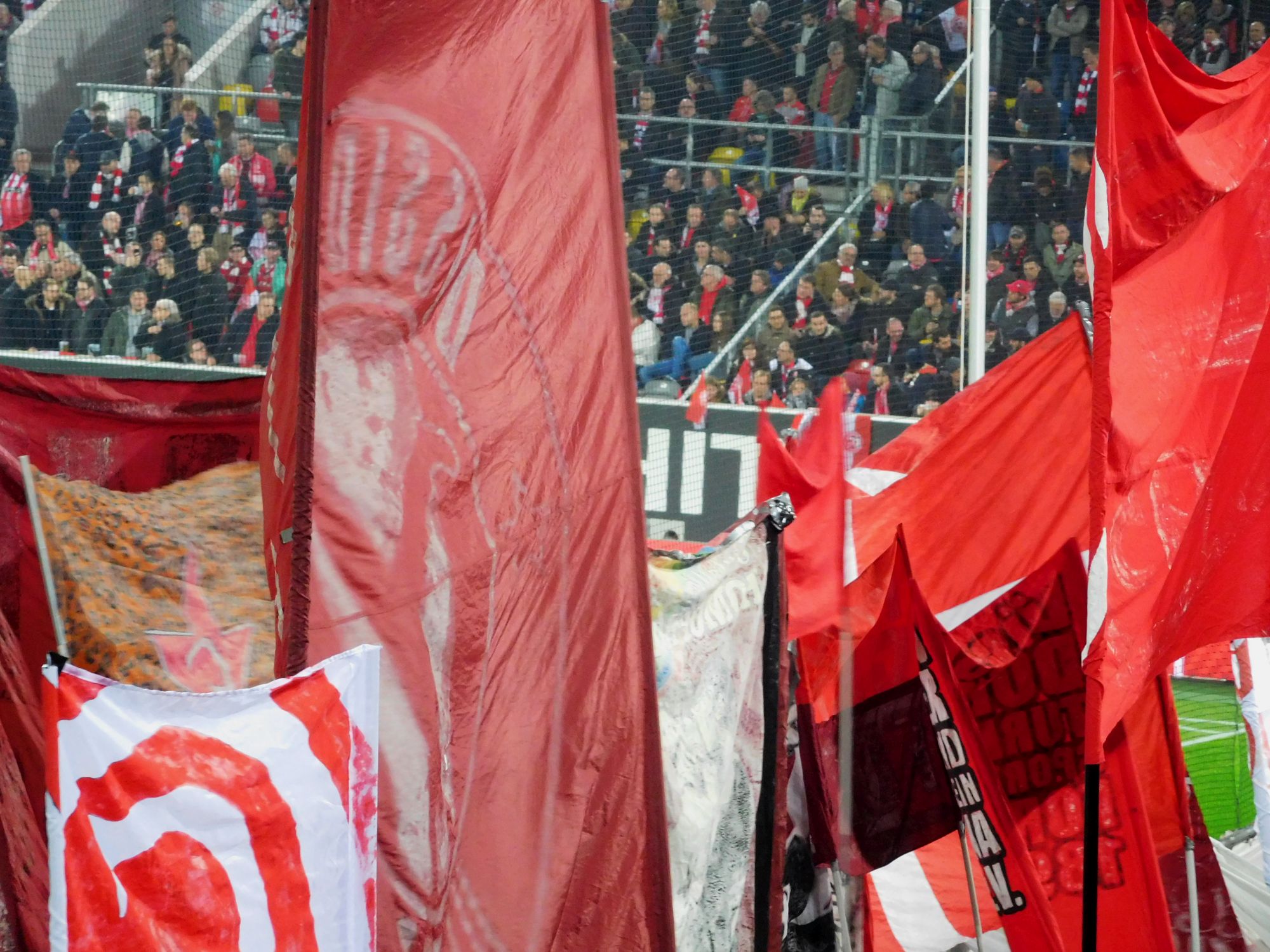 Frank, unser Lieblingsozialist im Block, meinte dazu: Der DFB bezieht sich aber mit seinem Fahnenwahn mehr auf Reichsparteitag, als auf Endspiele. Tatsächlich hat der deutsche Fußballverband ja nebenberufliche Fahnenschwenker, die bei jedem Heimspiel der DFB-Auswahl auf dem Rasen und hinter den Toren wedeln. Und zwar mehr so majestätisch. Damit soll das Ereignis Nationalmannschaftsspiel heroisch aufgeladen werden, meinte Frank. Und schwupps sind wir beim Reichsparteitag. Ganz anders die Schwenkereien der diversen Ultras drüben in den Blöcken 38 und 39 – das sieht lebendig aus, eher fröhlich. Das hat nix Heroisches oder Majestätisches. Und das ist gut so.
