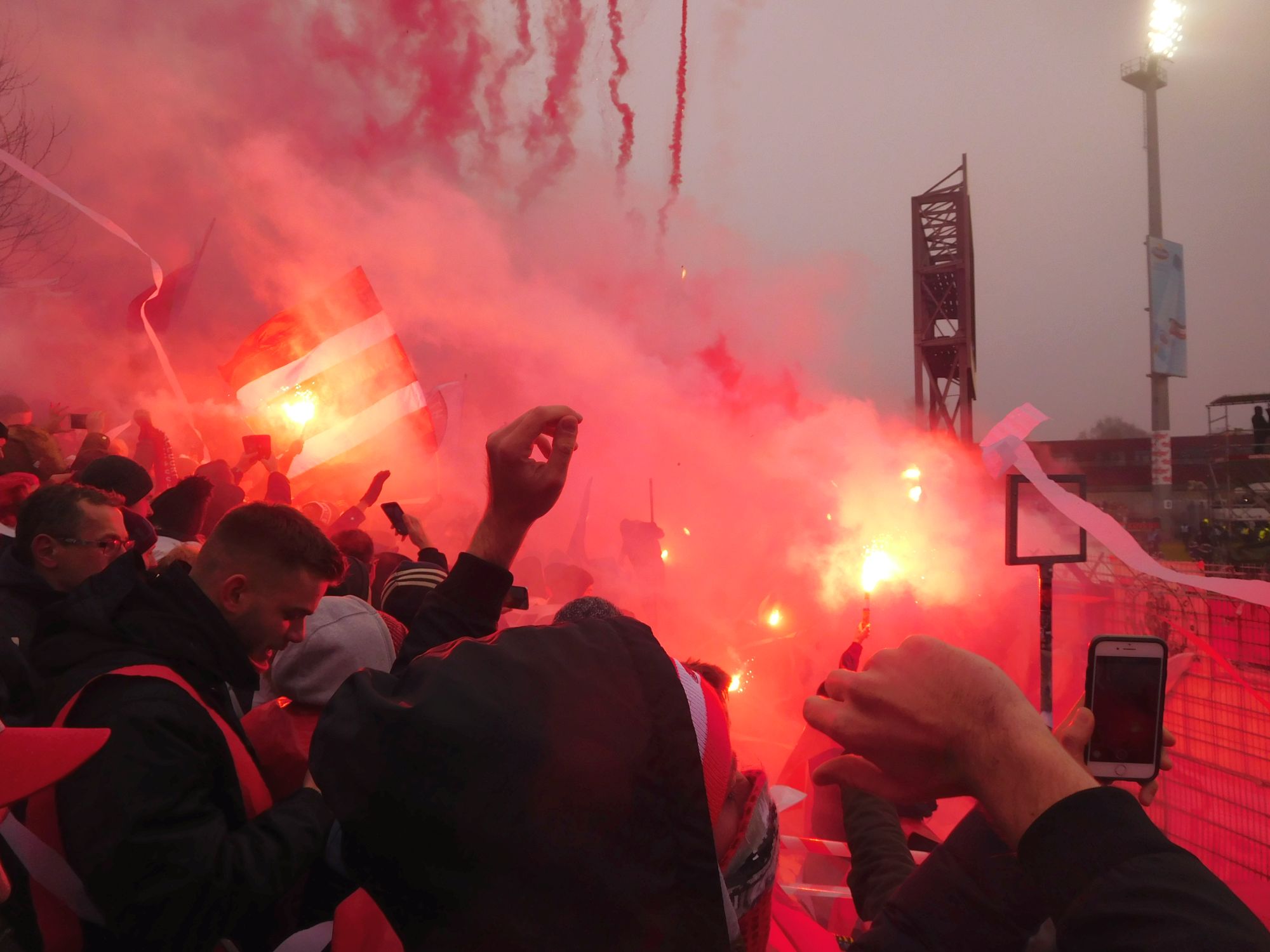 Eines der Bilder oben ist auf dem dicht gedrängten Rathausplatz bei der Meisterfeier entstanden. Hier war die Fackel auch nach kurzer Zeit wieder aus, da offenbar die umstehenden interveniert haben. Wir waren alle froh drum – auch hier war überwiegend Anti-pyro zu spüren…..