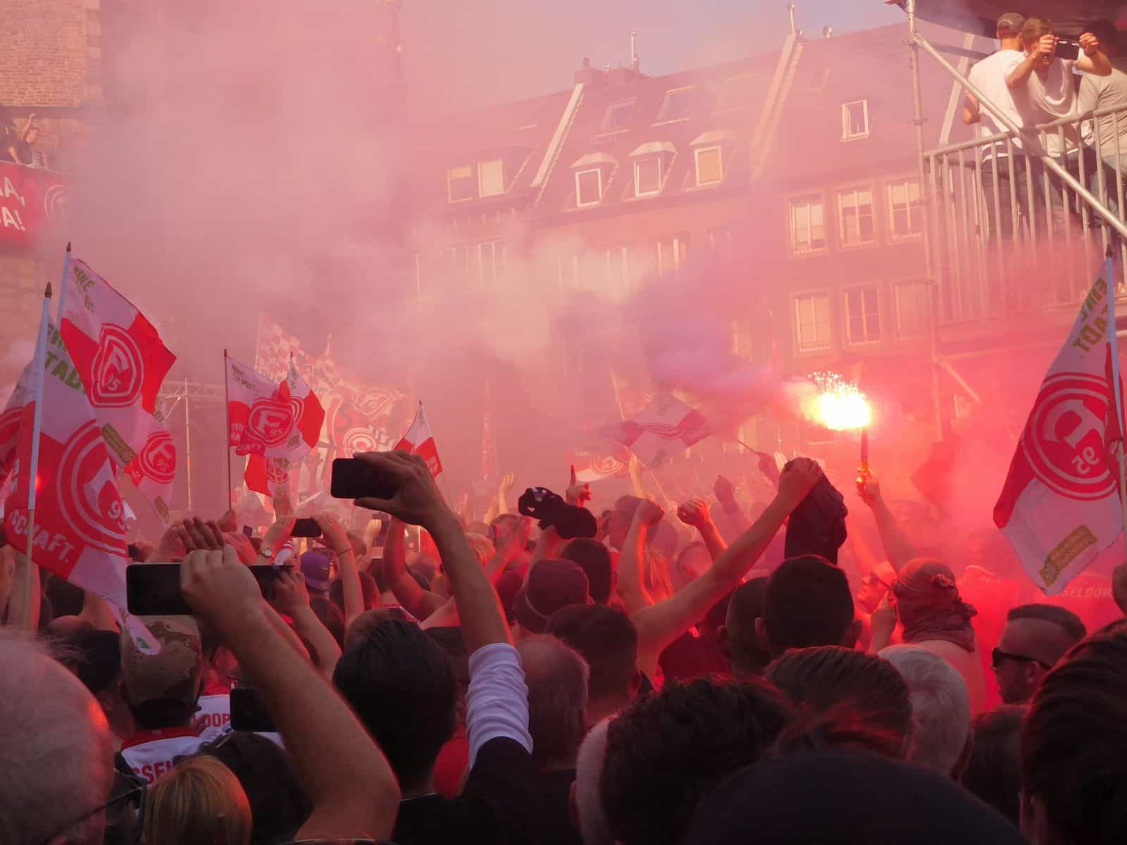 Durch die Blockadehaltung des DFB und den Trotz der Ultras wird der Pyro-Show mehr und mehr ihre Schönheit und ihre euphorisierende Wirkung genommen. Das kann man am Bengalo-Verhalten der F95-Ultras beim Spiel in Gladbach ganz gut ablesen. Konnte man die ersten beiden Aktionen noch im Sinne einer Choreo verstehen, bei der das Zusammenwirken aus blendend rotem Feuer, weißem und rosafarbenen Rauch und Hunderten rotweißer Fahnen wirklich alle Fans im Auswärtsblock mitriss, begann beim andauernden Zünden einzelner Bengalos und Rauchdinger dann doch das Kopfschütteln und man fragte sich: Muss jetzt jeder, der sich für mutig hält, seine persönliche Fackel abbrennen? Für die Stimmung brachte das gar nichts mehr. Im Gegenteil: Der Zorn der eigentlich pyrofreudigen F95-Fans stieg und erreichte fast das Niveau des Ärgers, den der Vorstandsvorsitzende Robert Schäfer später gegenüber den Medien äußerte.