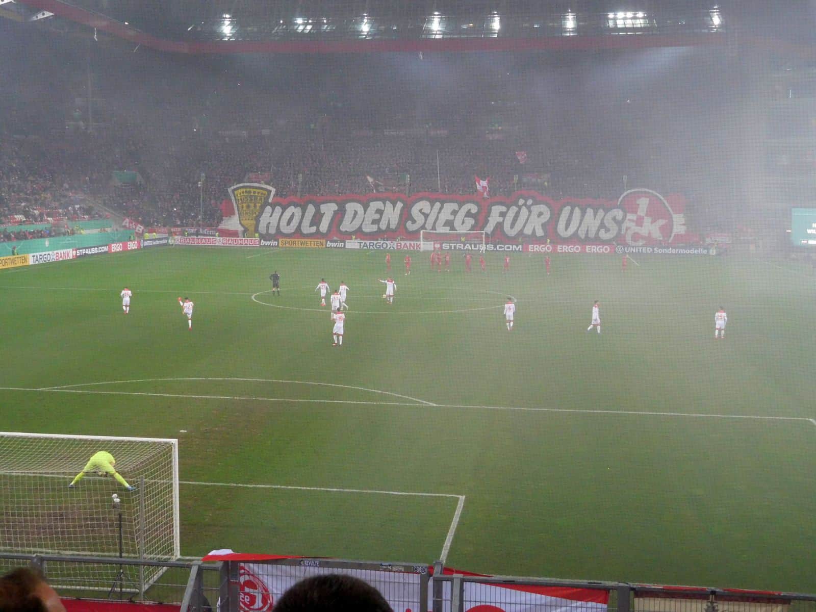 Der Zweifel hielt bloß bis zur 78. Minute als ein Hennings passierte, also ein Tor durch den coolen Rouwen: halbhoch mit links in leicht akrobatischer Körperhaltung und passgenau am Torwart vorbei. Und das nach einer Ecke, die Morales an der Ecke des Fünfers perfekt mit dem Kopf rüber legte. Da hatten die Zuschauer, ganz gleich, ob sie es mit dem 1. FCK hielten oder mit der Fortuna, vier wirklich schöne Tore durch den Tabellenvorletzten der ersten Liga sehen dürfen. Wobei man ohnehin sagen muss, dass die Atmosphäre zwischen beiden Lager, die sich mangels Fantrennung rund um den Berg und rund ums Stadion überall begegneten, ziemlich entspannt war; zumal Fortunen bei kurzen Gesprächen mit Lauterern fast durchweg ihren Respekt für die Leistung der Teufel und den Support der Kurve äußerten.