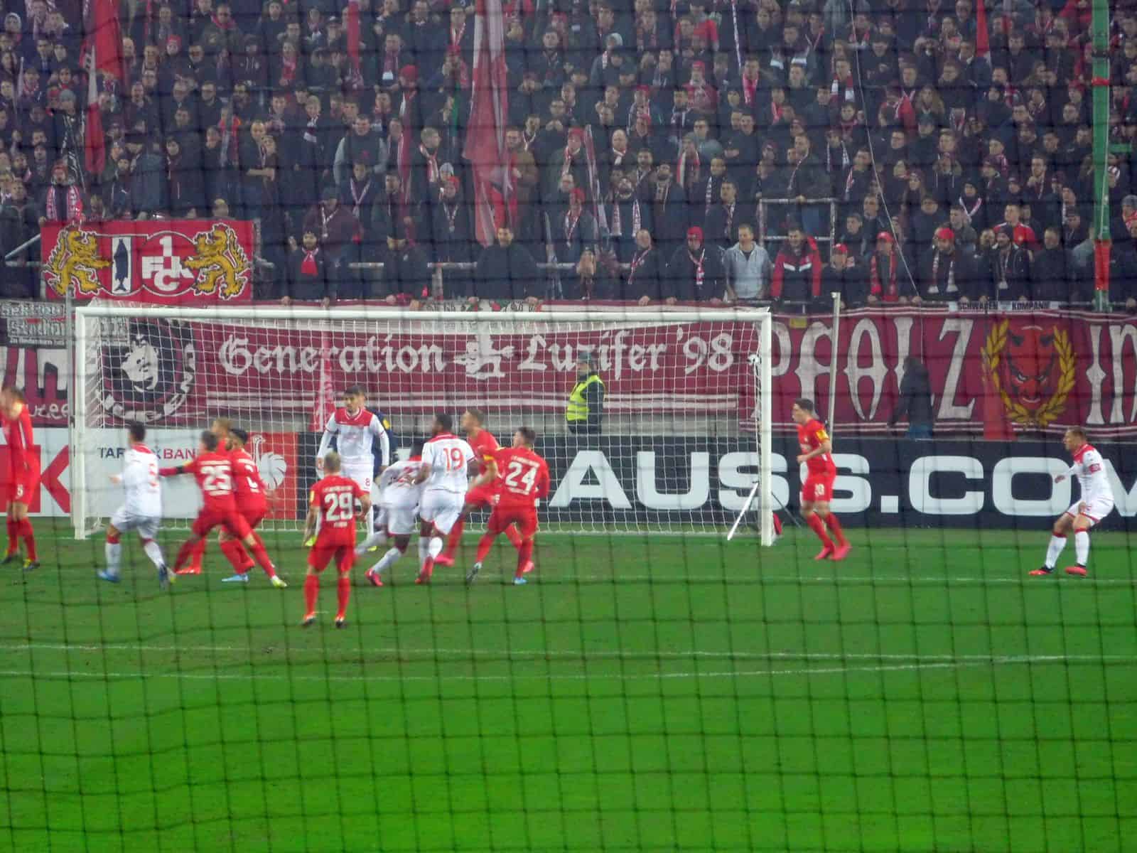 Jedenfalls gingen die Jungs in Weiß sofort nach Anpfiff ab wie Schmitz‘ Katz. Der Wirbel sah grandios aus, und schon 9. Minute zappelte die Pille im K’lauterer Kasten. Nana wurde von Zimmermann im rechten hintere Quadranten des Sechzehners angespielt, legte sich den Ball um und versenkte das Ding sauber im Netz. Der mit über 4.000 Schlachtenbummlern bestens gefüllte Gästeblock flippte aus – ohne das gleich allzu große Siegesgewissheit ausbrach, denn man kennt ja die Launen der Diva im Pokal. Tatsächlich schlugen die Bergbesitzer kaum eine Minute später zurück. Ein schneller Mann von denen hängte Gießelmann ab, drang von rechts in den Strafraum ein. Dort lungerte von Ayhan und Zanka in Ruhe gelassene Teufel herum, der den Pass kriegt und am kurzen Eck zwischen Pfosten und Kastenmeier einnetzt.