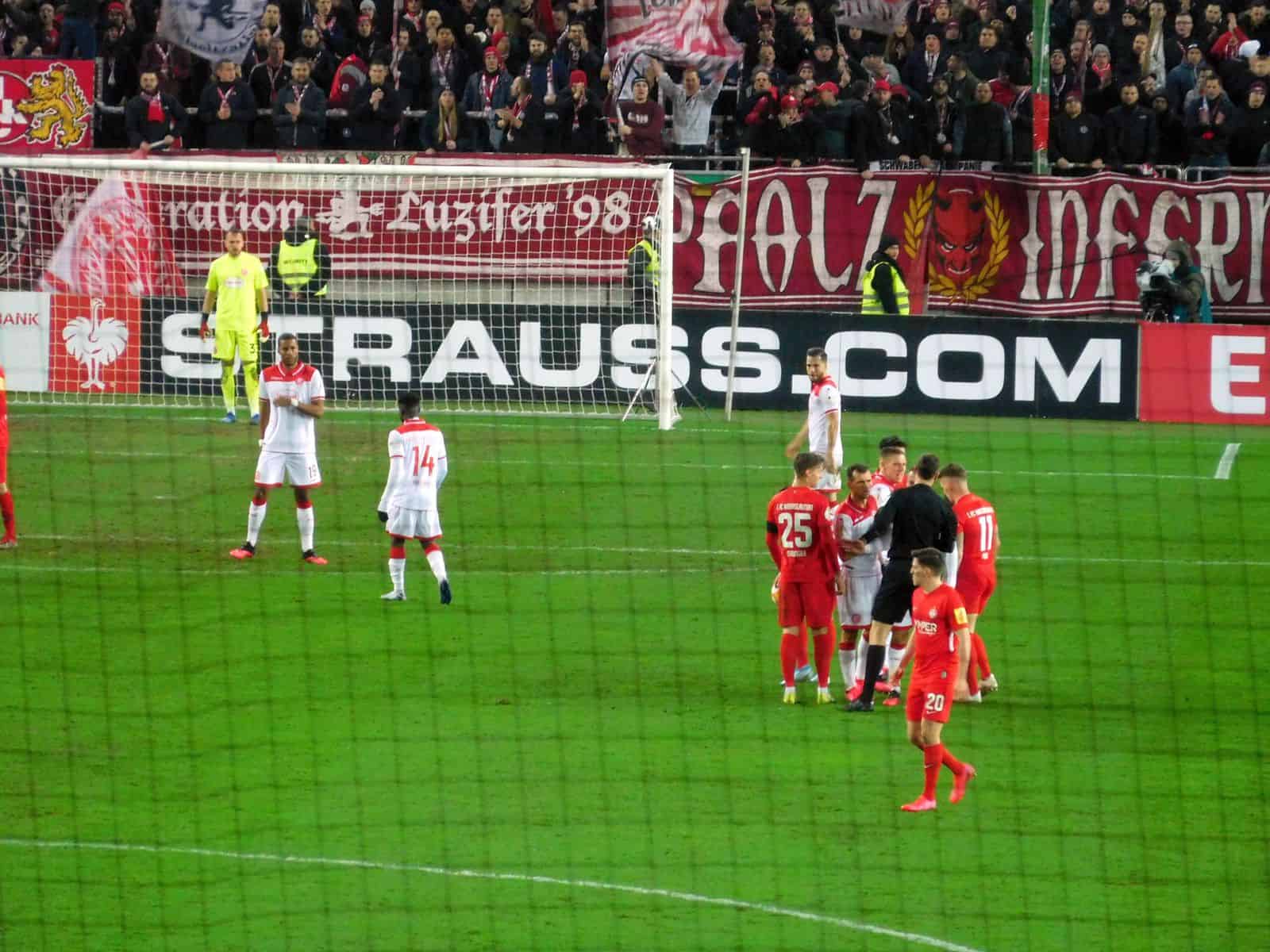 Nach dem Ausgleich zerbröselte das fortunistische Spiel sukzessive bis zur totalen Hilflosigkeit. Nicht dass die ziemlich roten Teufelchen wesentlich mutiger aufgetreten wären, sie standen nur etwas sicherer und ließen sich nicht mehr übertölpeln. Und wieder zeigte sich: Ohne kreatives Mittelfeld wird die Fortuna anno 2019/20 schnell zur lahmen Ente, die nicht mal mehr am Ende kackt. Das Ende vom öden Lied: Wieder zu spät gekommen semmelt Gießelmann einen Gegner im Sturmflug um, ohne zu beachten, dass die weiße Linie den Sechzehner begrenzt und ein Foul in demselben einen Elfmeter nach sich zieht. Ob der K’lauterer aus seinem Angriff irgendwas Zählbares hätte machen können, wird sich nie klären lassen. Wohl aber, dass der Strafstoß sicher hinter Kastenmeier landete und der Drittligist mit 2:1 in die Pause ging.