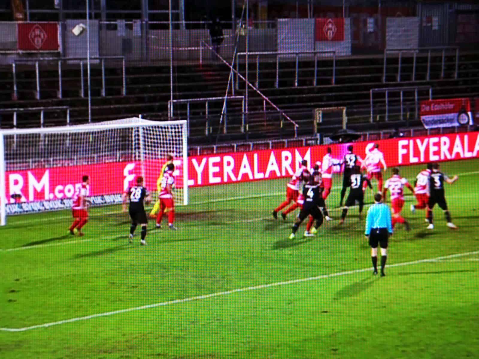 Die Überlegenheit in den ersten 40 Minuten war so groß, dass unser Düsseldorfer Sky-Kommentator Holger Pfandt meinte, ihm fehle die Fantasie sich vorzustellen, dass die Würzburger an diesem Abend noch irgendetwas reißen könnten. In der Expertenrunde, mit der Euer Ergebener in der Ära der Geisterspiele per WhatsApp konferiert, rührte sich dagegen schon so um die 15. Minute herum Unmut. Erster Anlass: In der 8. Minute kommt eine hohe, weite Flanke (von Zimbo? Oder von Klaus?) auf die linke Seite in den Kickers-Sechzehner, wo Toni Pledl völlig blank reingelaufen ist. Er braucht aber drei Anläufe die Pille unter Kontrolle zu bringen und versiebt damit einen Hundertprozenter. Wenn man doch sieht, dass das Ei nach dem Auftreffen auf dem Acker irgendwo hin springt, dann nimmt man es doch bitteschön aus der Luft!