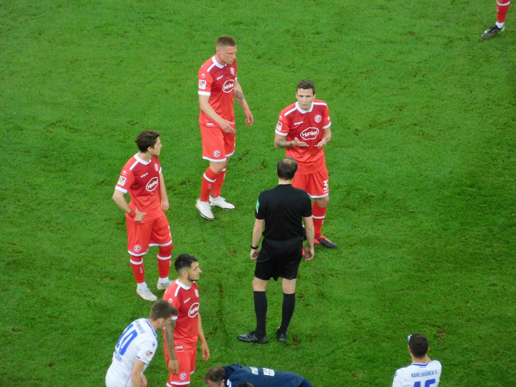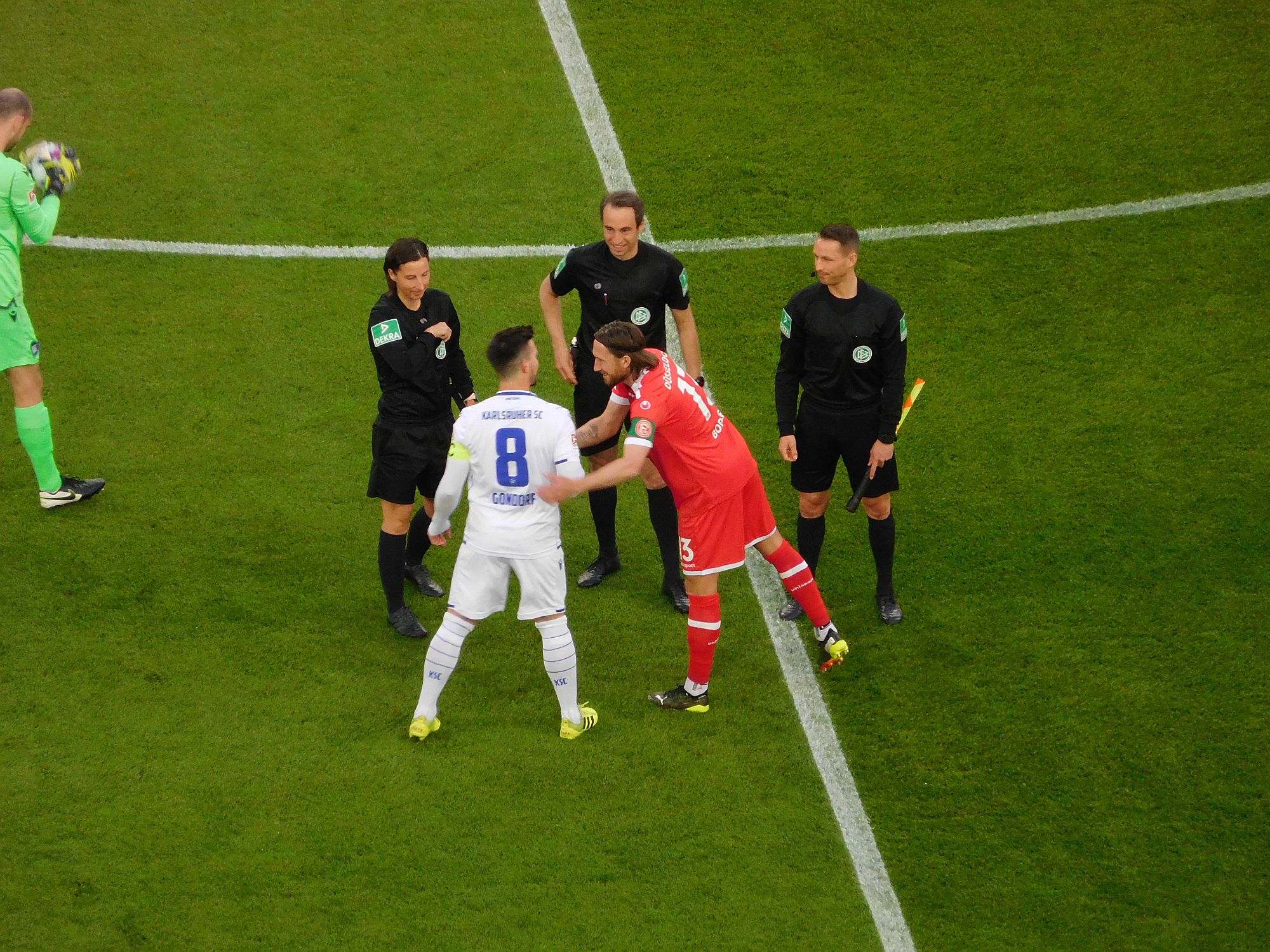 Nach einer Minute Nachspielzeit pfeift der bis dahin ordentliche Referee die ausgesprochen faire Partie zur Halbzeit ab. Um sie dann mit einiger Verspätung mit dem Anstoß für den KSC wieder in Gang zu setzen. Bis zur Pause gab es sage-und-schreibe addiert nur vier Fouls und keine gelbe Karte. Das bedeutet für den Emotionswert einer Partie nichts Gutes. Aber Spielleiter Patrick Alt hatte gegen die Langeweile ein paar Asse im Ärmel, die er in der Folge systematisch ausspielte. Manchmal fragt sich Ihr über alle Maße ergebener Berichterstatter, was Hauptschiedsrichter, Assistenten (gestern eine Assistentin darunter) und vierter Offizieller in der Auszeit so treiben. Telefonieren sie mit dem Videokeller? Schauen Sie sich die heißesten Szenen auf Sky an? Oder legen die sich einen Plan zurecht, die zweite Halbzeit nach ihren Wünschen zu gestalten? Und: Was trinken oder rauchen die, was werfen sie ein? Fragen über Fragen…