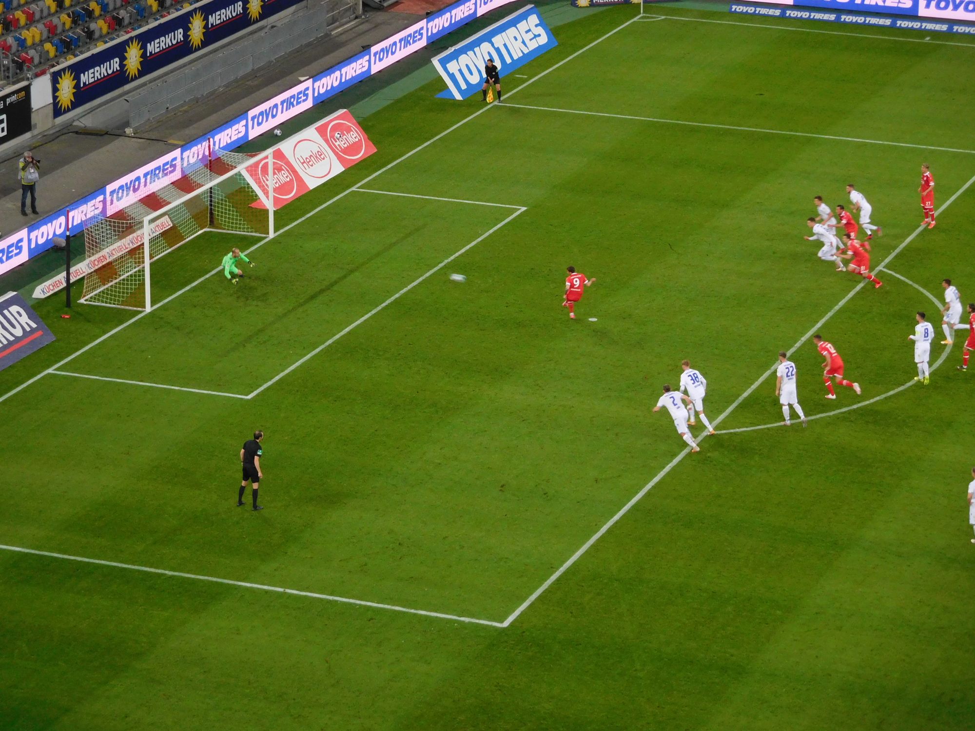 Und nun zeigt dieses Team, von dem man nicht immer wusste, was man von ihm halten soll, das, man was im Kommentatorendeutsch wahlweise „Charakter“ oder „Mentalität“ nennt. Die Buben wollen gewinnen! Kein Durchhängen, kein Zögern oder Zaudern – Druck, Druck, Druck. Teil 3 der Auswechslungen: Der elegante Emma Iyoha ersetzt den sichtlich ermüdeten Felix Klaus. Viel mehr Stürmer kann Rösler nicht bringen. Aber, es ist vor allem Shinta, dieser Teufelskerl, der nun das Spiel in seine Hand nimmt und vor Ideen nur so sprüht. Das in der 82. Minute. Und vier Minuten später schlägt dieser Düsseldorfer Jong einen Steilpass dahin, wo gleich zwei Kollegen auf den gegnerischen Kasten zulaufen. Hennings wenig bedrängt wenige Meter vor dem Tor … rutscht aus. Oh je, das war ein Hundertprozenter.
