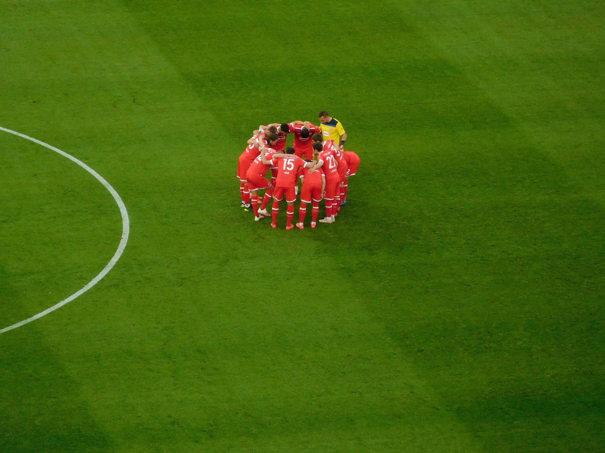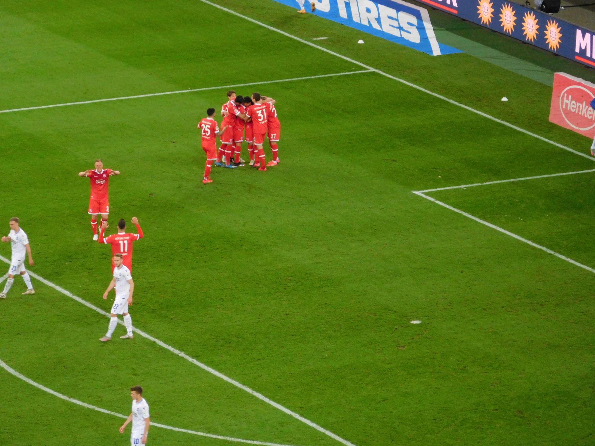 Es ist einer dieser Fortuna-Momente, in der Berge durch puren Glauben versetzt werden. Zugegeben sind die selten, aber wenn sie stattfinden, sind sie atemberaubend schön. 3:2 in der letzten Nachspielminute. Die Roten treffen sich feiernd in der Ecke, Flo kommt über den ganzen Platz gerast, eine Traube, ein Haufen, Vibrations von purer Freude. Uwe Rösler flippt völlig aus, setzt aber nicht – wie weiland Nobert Meyer, der sich auf einen solchen Haufen Spieler warf – zum langen Spurt an. Axel Bellinghausen hat eine rote Birne, dass man meint, er würde gleich platzen. Und während in der rechten Spielfeldhälfte verhalten gefeiert wird, spazieren Trainer UR und Käpt’n AB auf der linken Seite übers Gras, und der Coach erklärt dem Bodze gestenreich, was er demnächst besser machen könnte