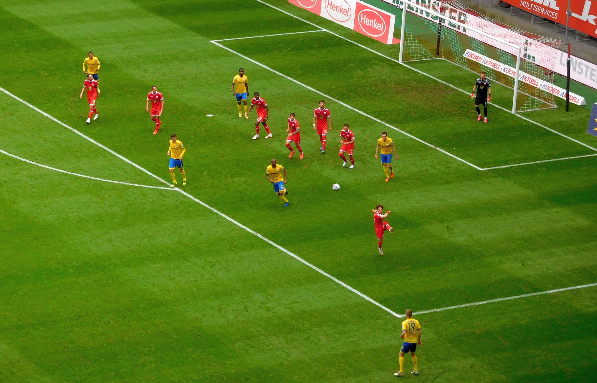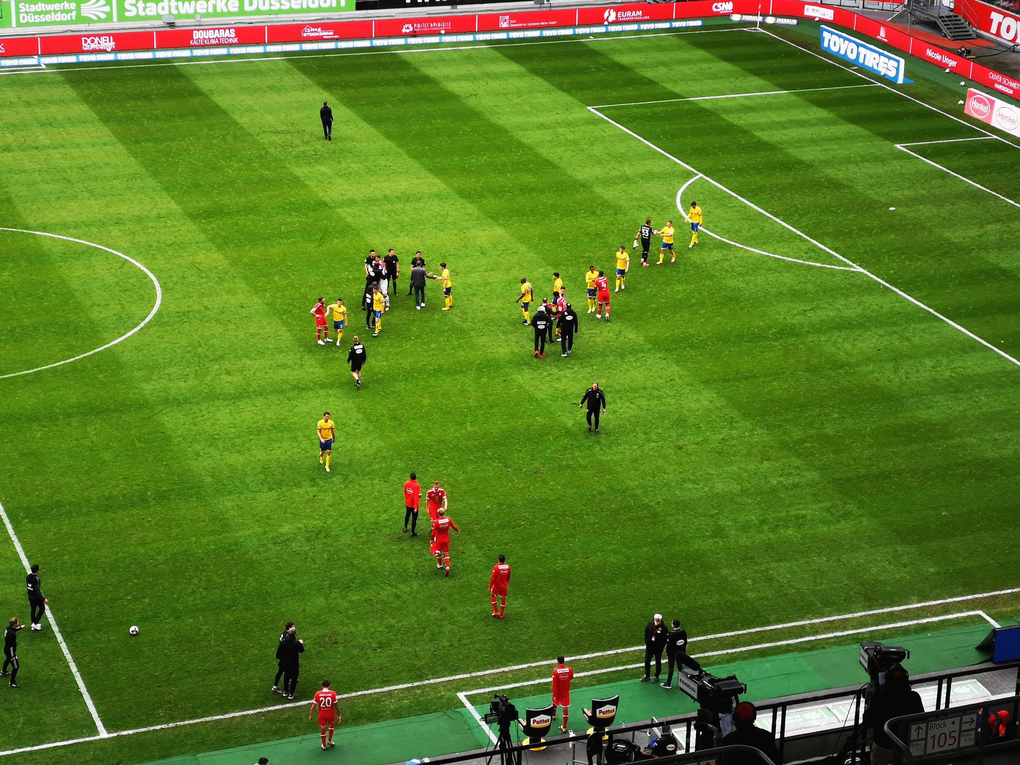 Aber nicht die Heimmannschaft, die nun (fast) ein 4-2-4 spielt, kriegt Oberwasser, sondern der potenzielle Absteiger, der einfach klarer auftritt, schnörkellos, direkt … und ein bisschen schlitzohrig. Bei den Fortunen wirbelt BB auf mindestens vier Positionen gleichzeitig. Hennings ist neben Kownacki gerückt und zeigt ihm in der Praxis wie hohes Pressing geht, und Bodzek weiß nicht so recht. In der 86. Minute haben die Braunschweiger die größte Chance zum Sieg, in der 89. und 90. noch einmal. Zwischendurch kommt es zu einer feinen Iyoha-Flanke auf die Brandon-Birne, die der aber nicht richtig erwischt – Fahrkarte. Die Roten sind nun durchgehend in der blaugelben Hälfte, kriegen aber nie Überzahl oder Räume zum Austoben.