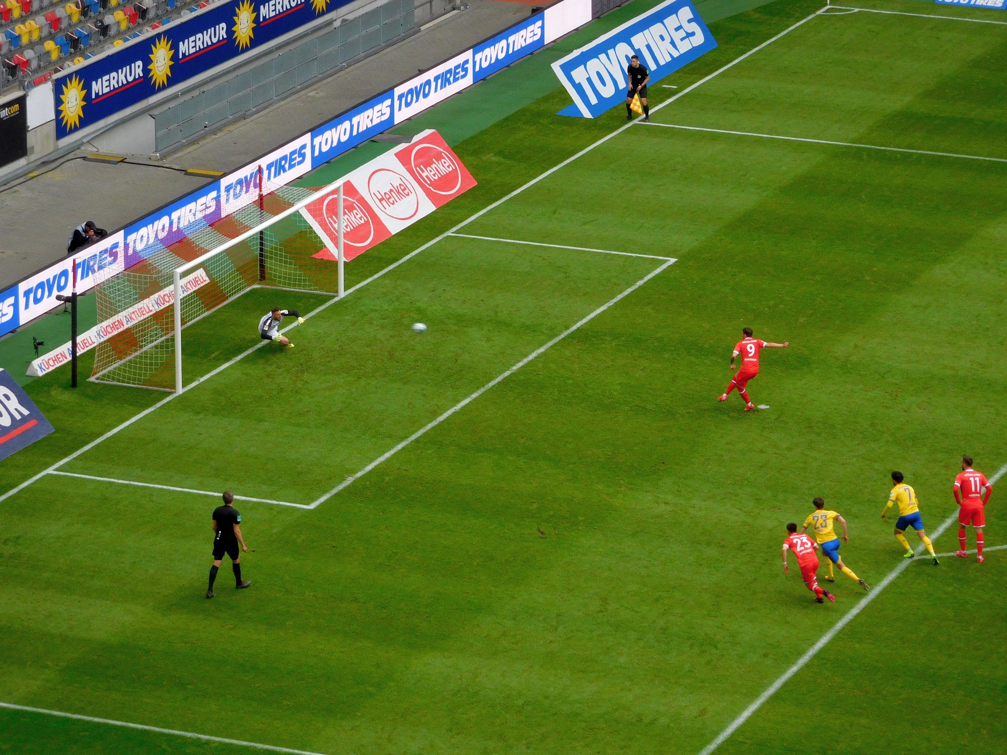 In der 30. kriegt der bis dahin perfekt spielende Kevin Danso was auf die Gräten, seine Auswechslung droht, und Christoph Klarer macht sich schon mal warm. Nicht dass Ihr Ergebener dem Kevin was Schlechtes wünscht, aber die Kombi Klarer + Krajnc hätte er gern mal in der Praxis erlebt. Zum Glück berappelte sich der einwurfstarke Hüne. Endlich, endlich gelingt es den Buben mal, den Braunschweiger Sechzehner in einen Hexenkessel zu verwandeln; die sind so in Schwung, dass die um einen am Boden liegenden BTSVler herum kombinieren. Der ruht direkt vor den Füßen des Schiris, und es ist die ureigene Aufgabe des Spielleiters das Geschehen per Pfiff zu unterbrechen – wenn eine Mannschaft in einer solchen Situation das Ei rausschlägt gilt das als fair. Kann aber passieren, dass die Kicker das in ihrem Wahn nicht so recht mitkriegen … oder dem anscheinend Verletzten seine Verletzung nicht glauben.