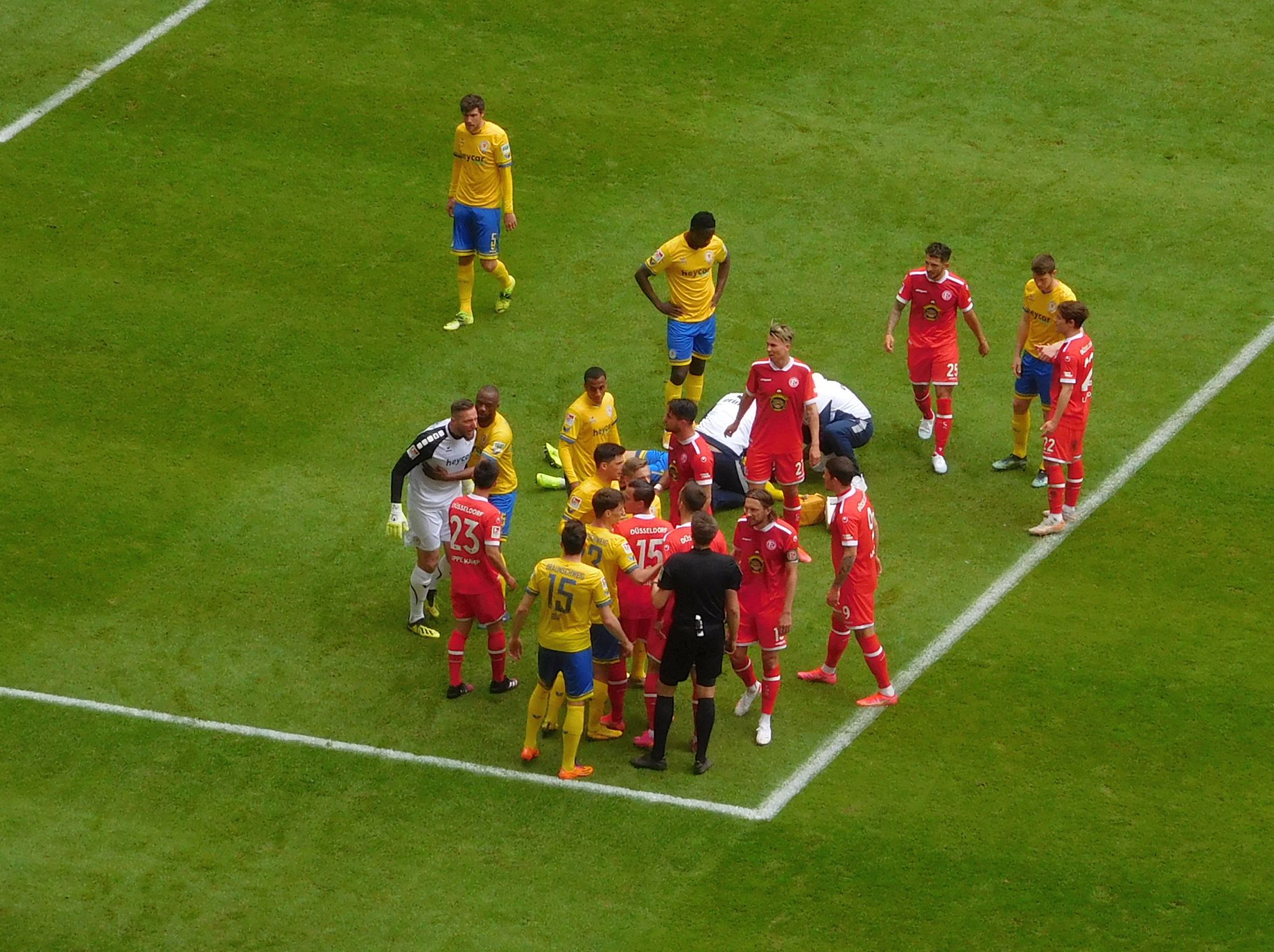 Jedenfalls wird bös gerudelt. Jemand geht Koutris an die Gurgel, der BS-Torwart rastet tierisch aus, und Käpt’n Bodzek lässt sich auch dazu hinreißen, einen Kontrahenten anzutatschen. Schiri Reichel schaut sich das an, behält die Ruhe, kriegt die Bande auseinandergerupft und verzichtet auf gelbe Karten – souverän gelöst. Nur bewirkt das Gemenge, das die Braunschweiger die Schauspielkunst für sich entdecken. Wäre nicht nötig gewesen, denn nach diesem Fortuna-Strohfeuer hat der BTSV die Sache im Griff und ist die klar überlegene Mannschaft. Obwohl die Statistik zu dem Zeitpunkt etwas anderes sagt: F95 liegt bei allen Werte – von Laufstrecke über Ballbesitz (55:45) bis hin zur Pass- (tolle 81 Prozent) und Zweikampfquote (52:48) – vorn; aber die Praxis sprach dagegen.
