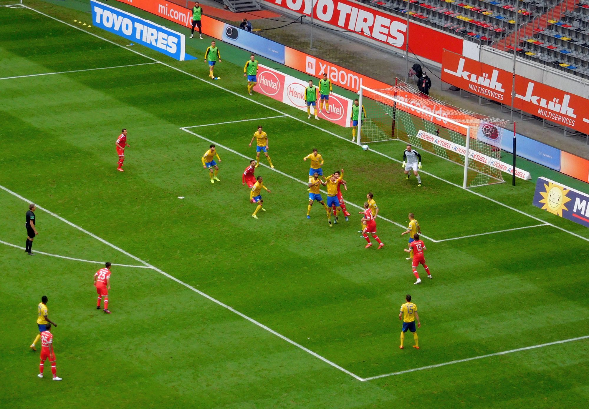 Zurück zur Praxis und damit zum Spielfilm. Uwe Rösler hatte also ein 4-2-3-1 hingestellt als der fehlerfreie Schiri Tobias Reichel, den wir in der laufenden Saison schon zum dritten Mal hatten und der uns als einer der wenigen Referees nicht verschaukelt hat, um Punkt 13 Uhr anpfiff. Irgendwo unterhalb der Pressetribüne und über der Gästebank übte sich ein Häuflein Was-auch-immer in Anfeuerungsrufen samt Geklatsche für die Eintracht – witzig. Gleich in der 3. Minute unterlief Zimbo am eigenen Strafraum ein übler Fehlpass, der auch Unglück hätte bringen können. Ansonsten stand der BTSV zu dieser Zeit mit einer Sechserkette in der Abwehr, und das fortunistische Pressing wollte nicht so recht klappen.