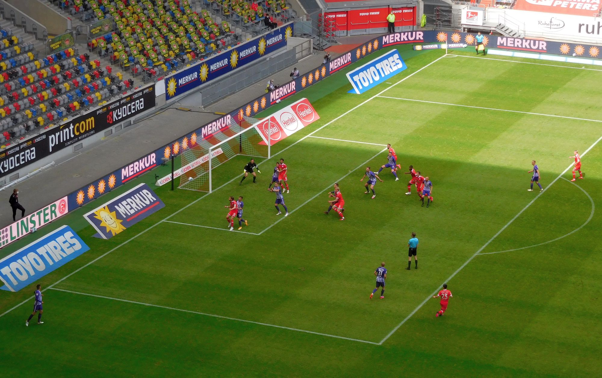 Eine spannende Variante, die man gern auch schon in vergangenen Spielen gesehen hatte, zeigte die Defensive. Bei eigenem Ballbesitz und im Aufbau rückte Käpt’n Bodze regelmäßig als dritter Mann in die Mitte der Abwehrkette, sodass Leonardo Koutris und Matthias Zimmermann auf den Flügeln freie Hand in der Offensive hatten. Da sah es dann öfters nach einem 3-5-1-1 aus. Wobei fast alle einschlägigen Medien bei der grafischen Darstellung der F95-Startaufstellung falsch lagen: Spitze spielte Kenan Karaman und nicht, wie meist gezeigt, Emma Iyoha. Shinta Appelkamp agierte zentral mit Emma und Felix Klaus auf Außen. Cello Sobottka gab den Box-to-Box-Sechser, während Adam Bodzek einen Tacken hinter ihm als Ballverteiler agierte – entweder in der Dreierkette oder vor der Viererkette. So ergab sich entweder eine vertikale Achse Bodzek – Sobottka – Appelkamp, oder Shinta und Cello spielten nebeneinander als Achter.