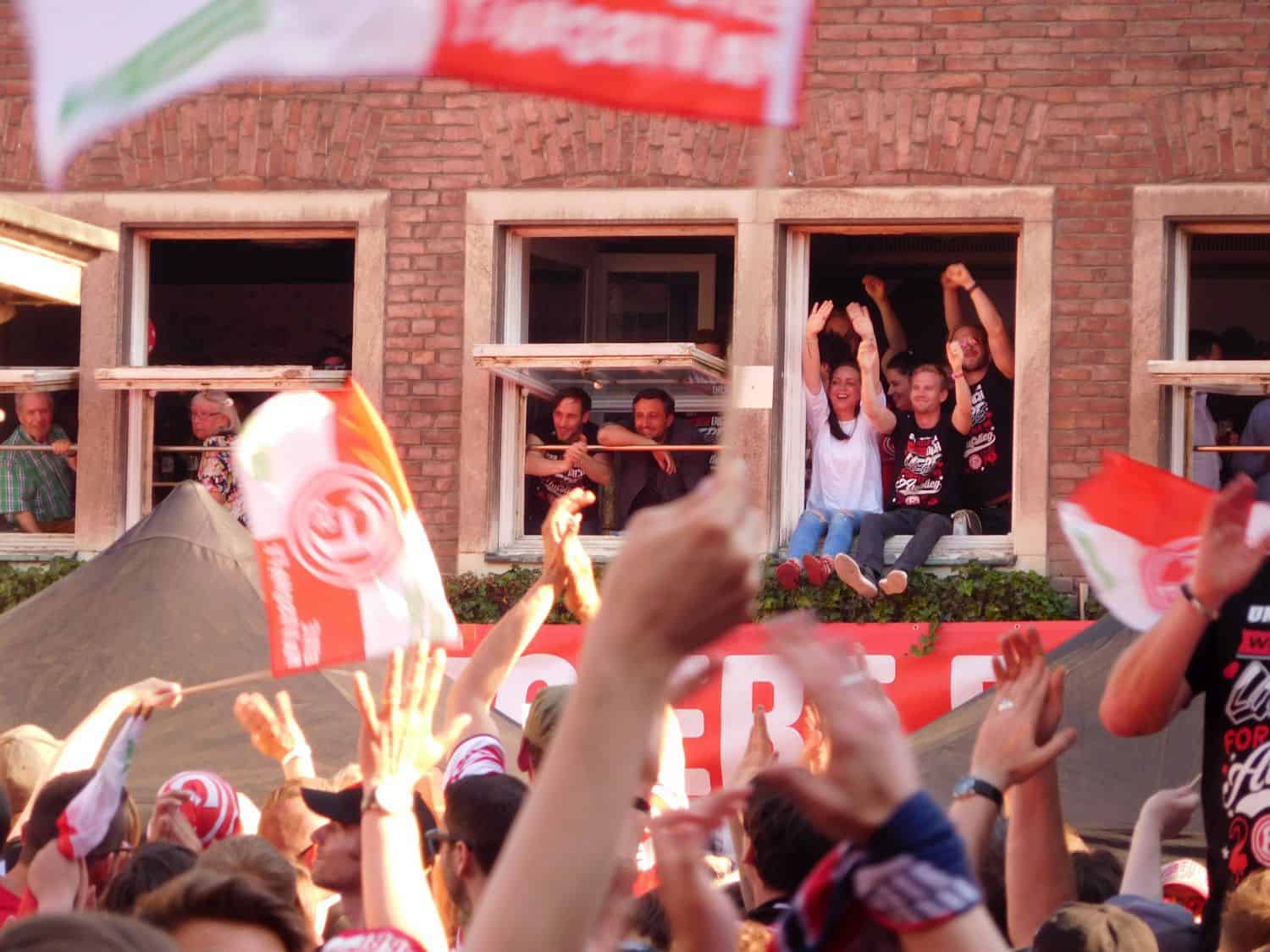 Die F95-Mitarbeiter in den Fenstern der Alten Kämmerei bei der Aufstiegsfeier im Mai 2018