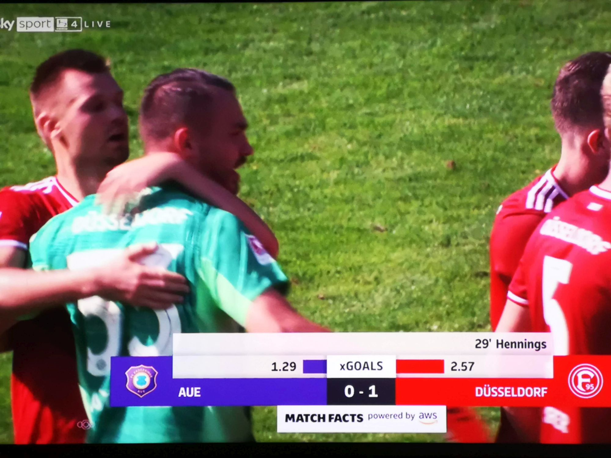 Besonders über die rechte Seite entfaltete die glorreiche Fortuna nun mit den Hauptdarstellern Felix Klaus und Khaled Narey ordentlich Druck. Schon die Ecke, die Tanakas Nicht-Tor vorausging, war eine Klaus’sche Tat. Jetzt drehte er mit Speed in den Sechzehner. Sein Auer Gegenspieler stellte sich maximal ungeschickt an und holte den Felix von den Stollen, so gerade eben im Strafraum. Den Elfer musste der nicht immer ordentlich pfeifende Schiri Aarnink geben. Rouwen Hennings trat an, wollte den Torhüter ausgucken, der in seine rechte Ecke flog, während unser Schlitzohr den Ball in die Mitte mehr chippte als schoss. Beinahe wäre der Keeper noch mit dem grätschenden Bein an die Kugel gekommen. So aber: 1:0 für F95 in der 29. Minute.