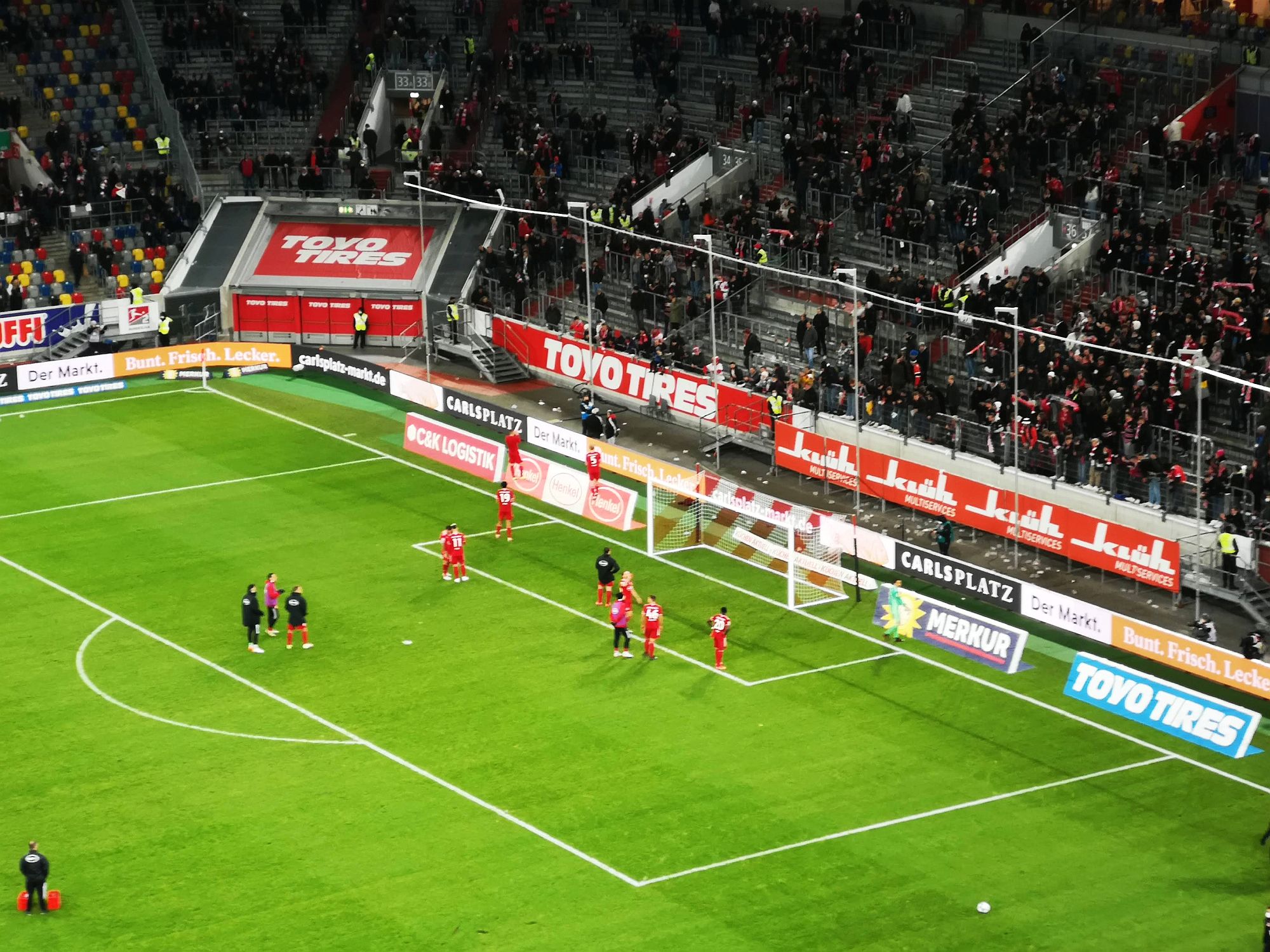 Es war übrigens kein schlechtes Fußballspiel, zwar eine eher kampfbetonte, aber insgesamt recht interessante Partie zweier ziemlich diszipliniert auftretender Mannschaften. Von den Presseplätzen aus weit oben auf der Tribüne konnte man sehr gut sehen, dass gerade die Fortuna zum Beginn einer neuen Situation immer fein in die 4-4-2-Grundordnung zurückkehrte. Die Heidenheimer dagegen glänzten mit einem schwer knackbaren Defensivverbund, der sich keine Stellungsfehler leistete. Das ist auch daran ablesbar, dass Ihr Ergebener in der zweiten Halbzeit insgesamt 12(!) im HDH-Sechzehner geblockte Schüsse strichlistete.