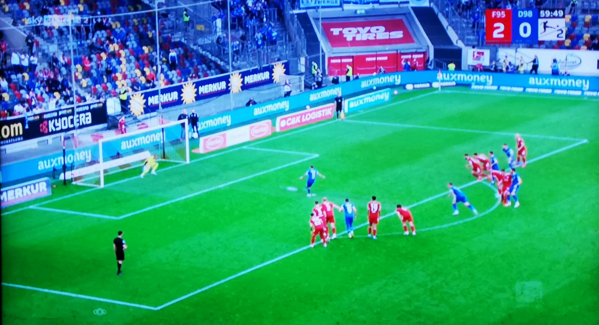 Und der Druck wurde groß, gigantisch so gar. Die Dreierkette ging nun bei jeder fortunistischen Annäherung mit vollster Härte vor und schüchterte so auch die nicht ganz so robusten Kollegen Appelkamp, Klaus und Iyoha ziemlich ein. Die aber sortierten sich, wie zuvor schon Tanaka, voll diszipliniert in die Abwehrarbeit ein. Und dann passt es in der 59. Minute im eigenen Sechzehner mal nicht so ganz. Ein Darmstädter wird Richtung Fünfer halbrechts angespielt und hat nur noch Flo Kastenmeier vor sich, dem gar nichts andere übrigbleibt als zu versuchen dem Angreifer die Kugel vom Fuß zu pflücken. Und das gelingt zunächst – nur zieht der Flo dabei die andere Hand hoch, und über die stolpert dann der Darmstädter … der allerdings auch früher abhebt als nötig.