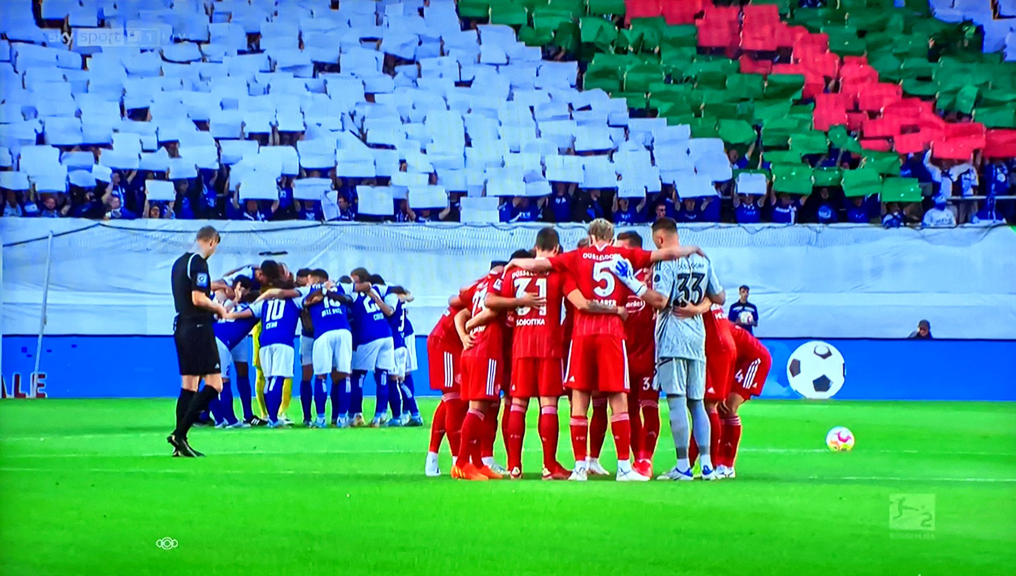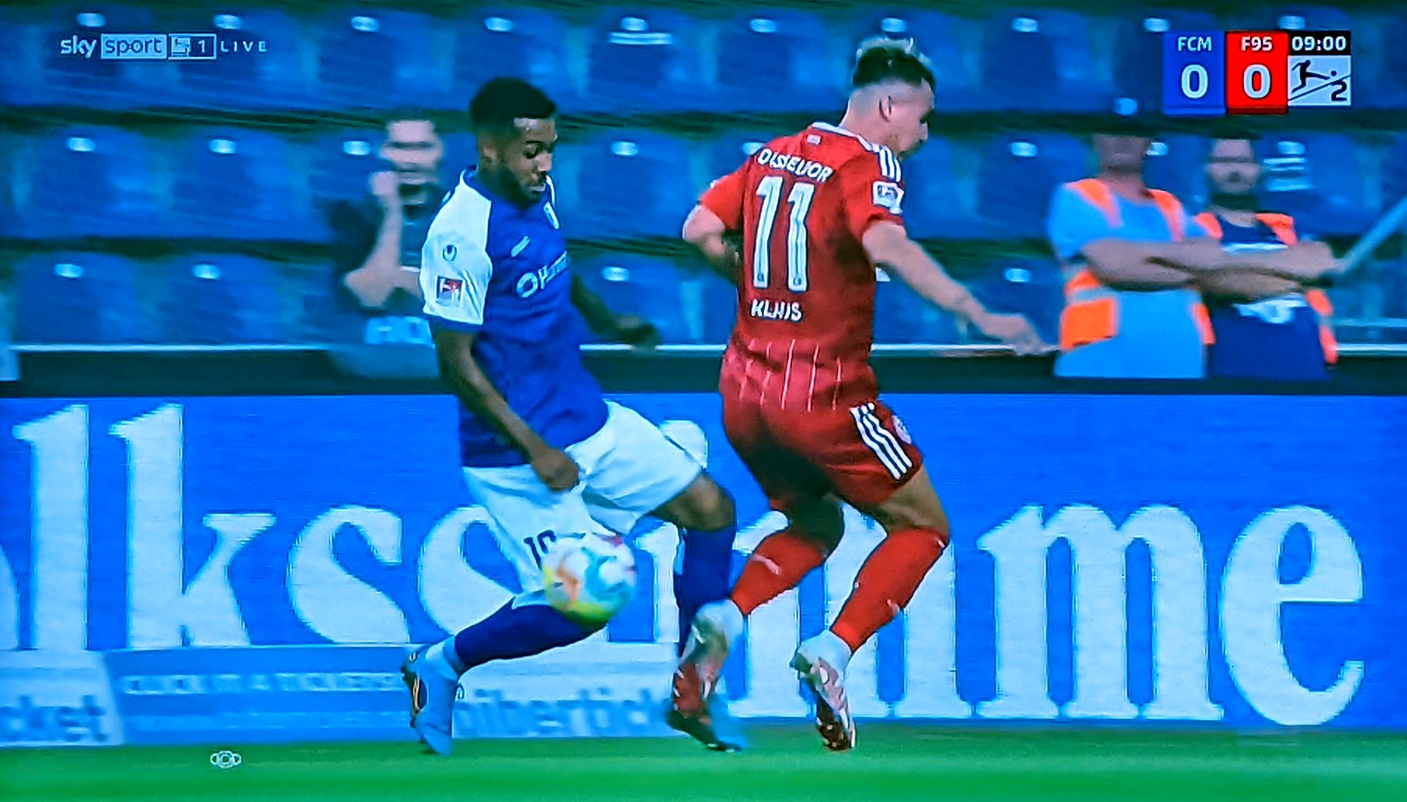 Den Schiri, der die von der DFL für die Liga neu verordnete Linie bestens vertrat, hat der Ergebene schon gelobt. Besonders gut, dass der Schwarzmann nicht auf die Kulisse hörte, denn die Magdeburger Anhänger sind berühmt dafür, immer lauthals Freistöße zu fordern, wenn einer der ihren irgendwie hinfällt. Das weiß auch Baris Atick, der in der 16. Minute versuchte einen Elfer zu ziehen und froh sein konnte, keine gelbe Karte wegen Schwalbe zu bekommen. Besser aber, dass Aarnink die Situation einfach weiterlaufen ließ. Insgesamt viermal musste er sich mit den Grottenolmen im Kölner Keller abstimmen. Beim nicht gegebenen Tor für F95 in der 26. Minute brauchte er deren Hilfe nicht, denn der gute Schuss von Felix Klaus wurde von Chris Klarer tatsächlich mit der Hand abgefälscht, bevor er in die Maschen rauschte.