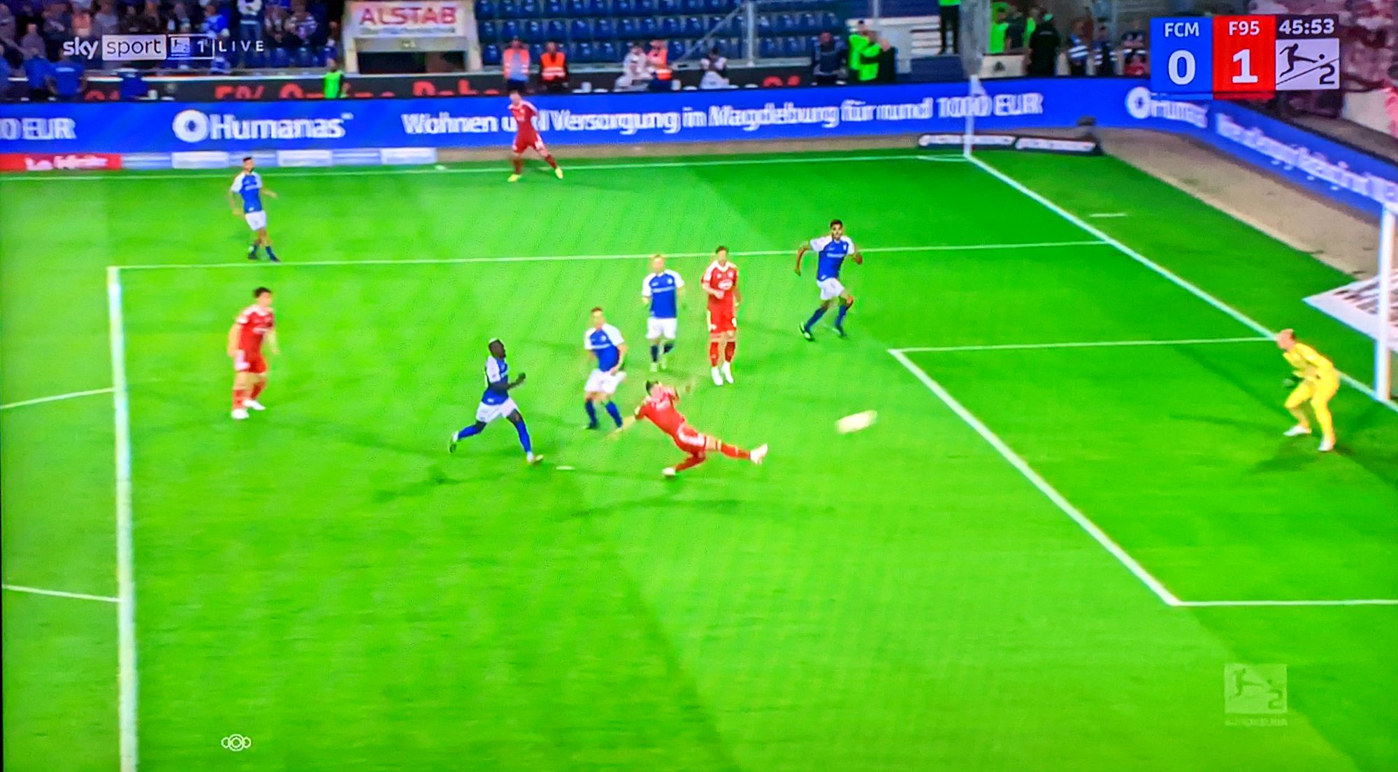 Hatten die FCMler vor der Pause noch mit 6:2 Torschüssen die Nase vorn, stand es in dieser Disziplin am Ende 16:13 für unsere Jungs. Dass es so viel mehr Gelegenheiten für die Roten gab, lag vor allem im drastisch verbesserten Spielaufbau, an dem besonders Ao Tanaka einen Riesenanteil hatte. Auch dadurch befördert, dass Cello Sobottka ihn nun mehr als seinen Sechser-Kumpel erkannte. Um den vielleicht schwächsten Fortunen der Begegnung an dieser Stelle zu erwähnen: Von Nicolas Gavory kam in dieser Hinsicht so gut wie nichts, und manchmal fragt man sich ohnehin, wie er seine Rolle als Außenverteidiger überhaupt interpretiert. Könnte sein, dass der F95-Kader exakt an dieser Stelle neben dem noch sehr unerfahrenen Benjamin Böckle eine Alternative braucht.