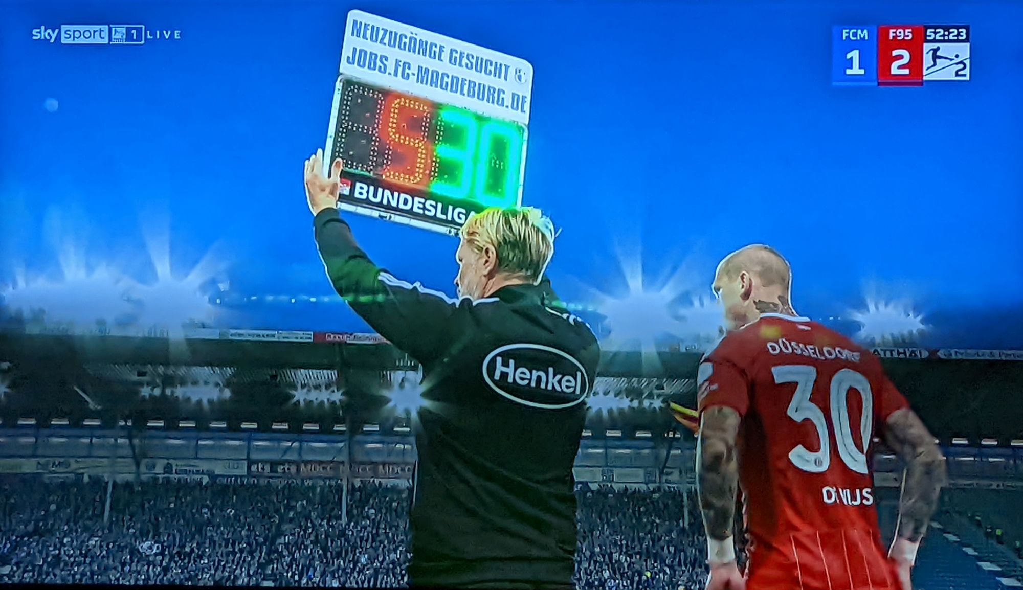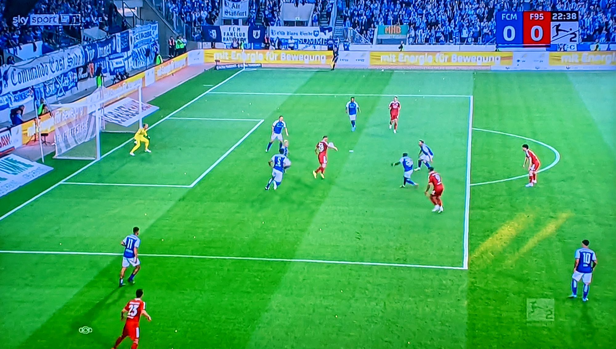 Apropos Ecken: Da haben die Coaches in der Vorbereitung offensichtlich optimiert, denn alle drei Eckbälle brachten Gefahr für den Gegner. Knifflig für den Referee wurde es 38. Minute. Nachdem er nach einem Foul im Sechzehner an Kownacki auf den ominösen Punkt gezeigt hatte, meldeten sich die VARisten und schlugen vor, er möge doch mal nachschauen, ob es da vorher nicht ein Abseits gegeben hätte. Hatte es, wenn auch hauchdünn durch Tanaka. War also nichts mit einem Strafstoß. In der 42. Minute meldete sich der Keller erneut und machte Aarnink auf das mögliche Handspiel durch einen FCM-Verteidiger aufmerksam, das dieser nicht gesehen hatte. Mal ehrlich: Wer hatte das denn überhaupt gesehen? Der Verursacher, der schon zuvor an so ziemlich jedem Defensivversagen der Hausherren beteiligt war, konnte einem leidtun.