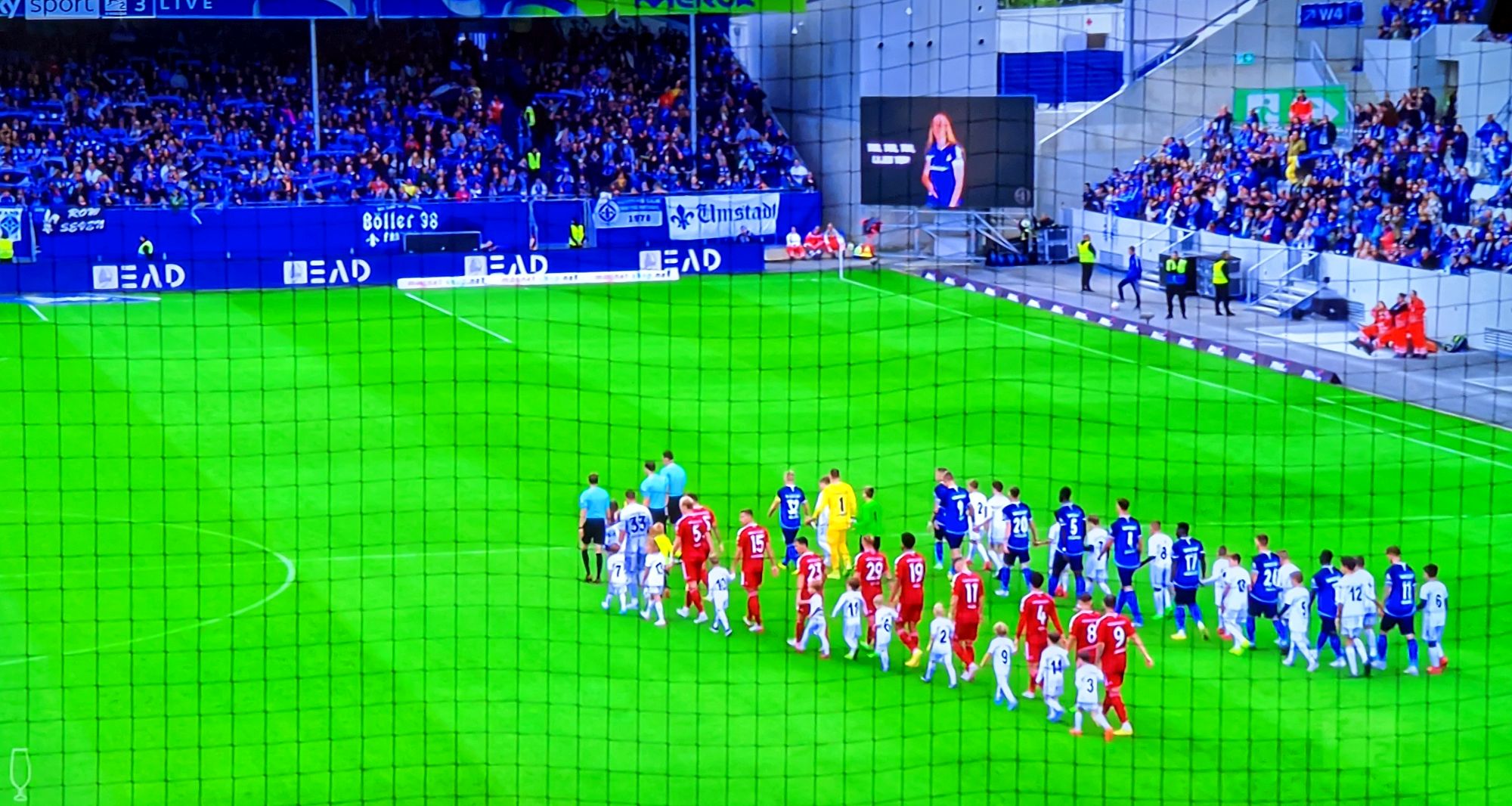 Überhaupt war die Stümmung im ausverkauften Merck-Stadion am Böllenfalltor – so der offizielle Name – bei schönstem Wetter prächtig. Zum ersten Mal konnten Zuschauende auf der neu errichteten Tribüne sitzen; der allgemeinen Atmosphäre dieses Traditionsspielorts hat der Umbau nicht geschadet. Rein geografisch ist auch der Standort des Gästeblocks erhalten geblieben, der natürlich ebenfalls pickepackevoll war.