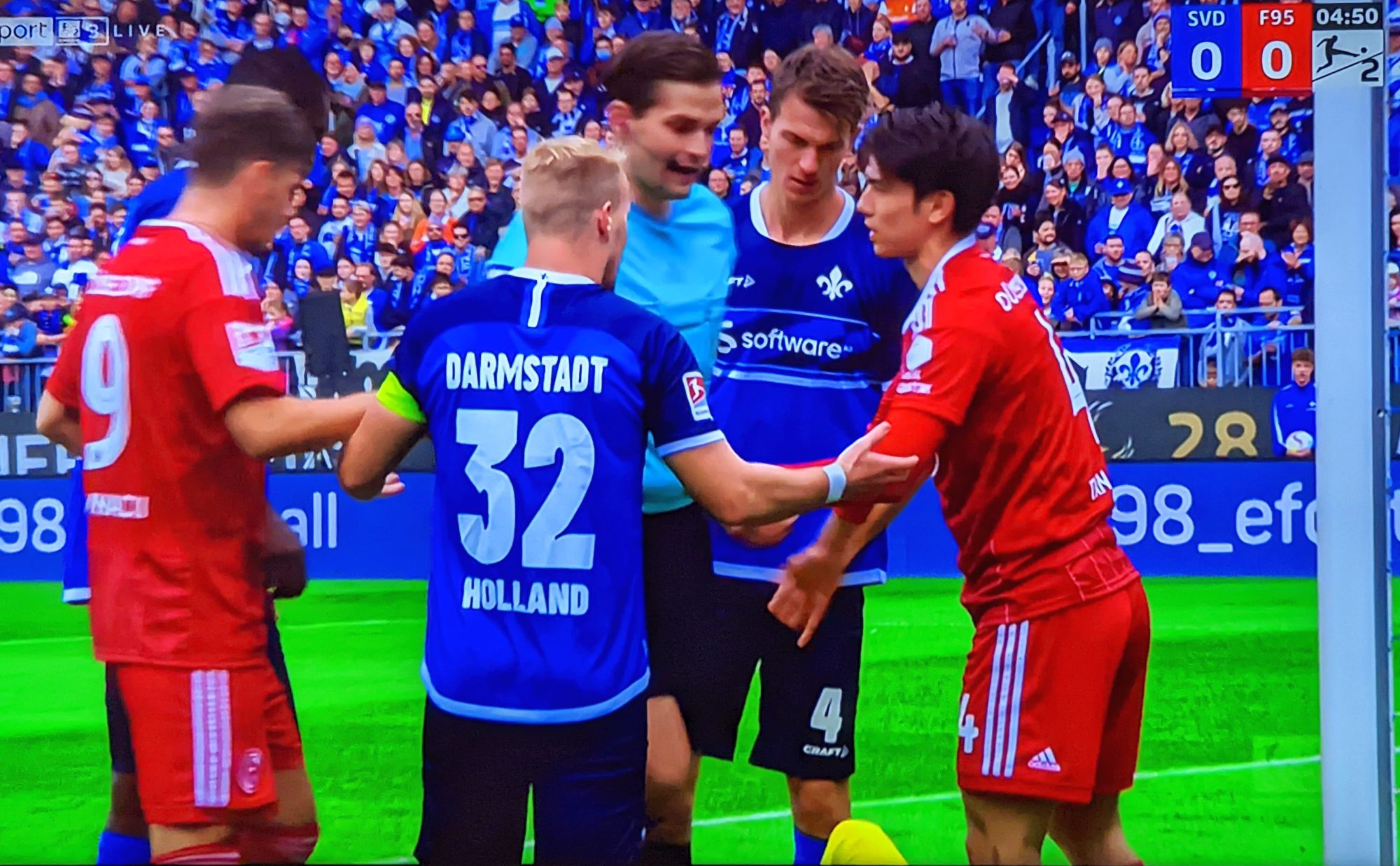 Ein weiterer Darmstädter kommt von außen angeflogen, berührt aber den Ball nicht, der ins Gehäuse flutscht. Erstaunlich, dass die kölschen Grottenolme nicht grunzten, denn der eben erwähnte Flieger könnte im passiven Abseits gewesen sein. Die verfügbaren Ausschnitte geben leider nicht her zu beurteilen, wo genau sich dieser SVDler zum Zeitpunkt des Kopfballs befand. War er abseits, dann hätte das Tor nicht gegeben werden dürfen, weil er unseren Keeper irritiert hat. Der einzige Fortune, der den Reklamierarm hob, war übrigens Chris Klarer, die anderen trabten folgsam zum Anstoßpunkt. Wie gesagt: Die VARisten hätten sich melden müssen, zumal der ausgezeichnet pfeifende Schiri Burda die Gesamtsituation nicht überblicken konnte und sein Assistent auf der anderen Seite stand.