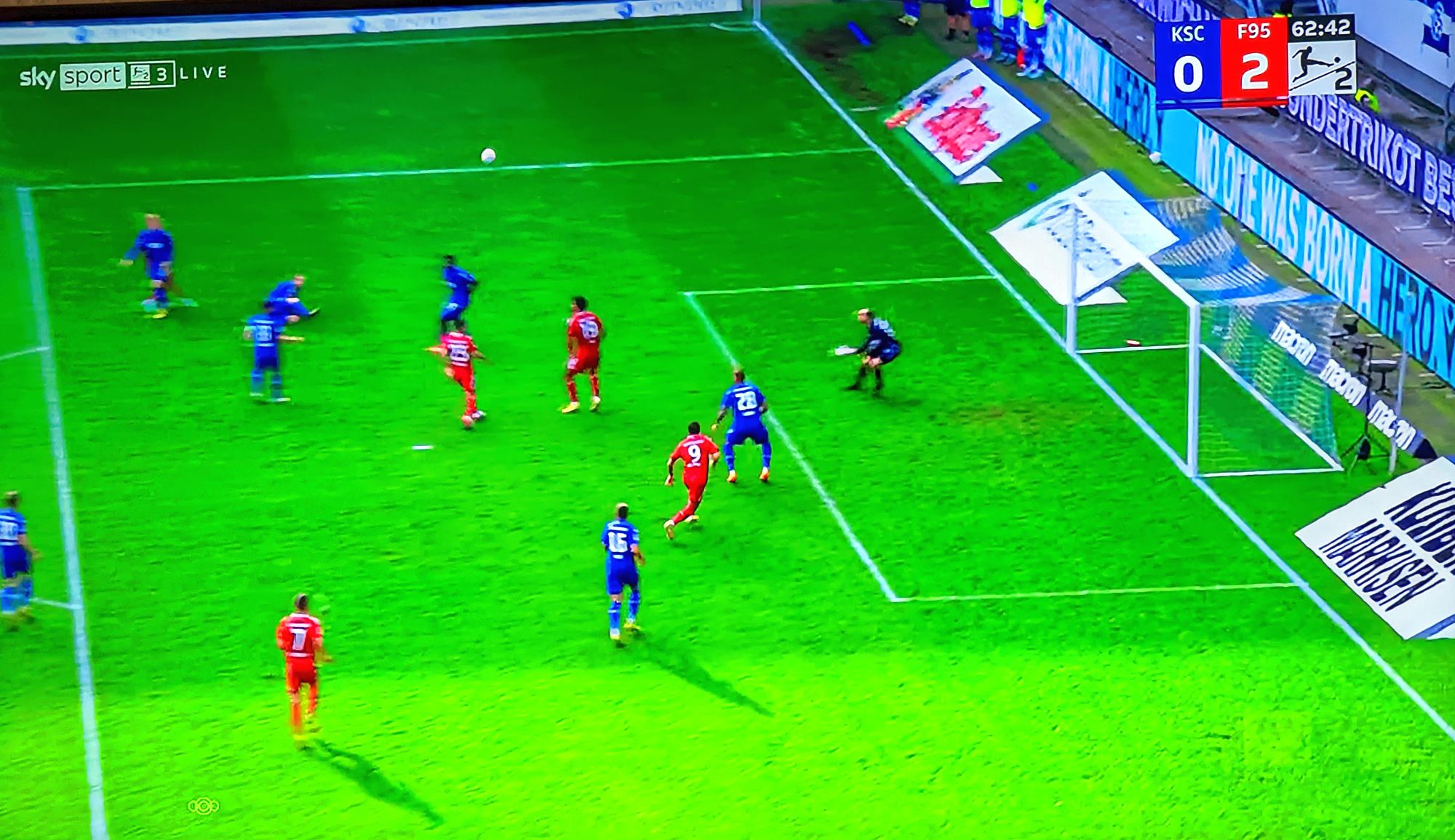 Dass Michal so viel vorne und so wenig hinten tun musste, lag auch daran, dass Trainer Thioune mit einer Dreierkette spielen ließ. Dreierkette? Wirklich? Auch wenn diese auf dem Platz nicht immer deutlich wurde, tatsächlich hatte er Zimbo Zimmermann in der Vorsprechung eröffnet, dass er als dritter Innenverteidiger auftreten würde. Dies genau um Karbownik mehr Offensivmöglichkeiten zu eröffnen. Wobei die gesamte taktische Grundordnung aber auf große Flexibilität angelegt war, denn in der Realität der KSC-Angriffe waren es dann doch vier und nicht fünf Mann, die den letzten Riegel bildeten. Dafür aber verließ Chris Klarer in Umschaltsituationen seine Position und wurde dann abwechselnd von Cello Sobottka (der wieder ein tolles Spiel lieferte) oder Ao Tanaka abgelöst.