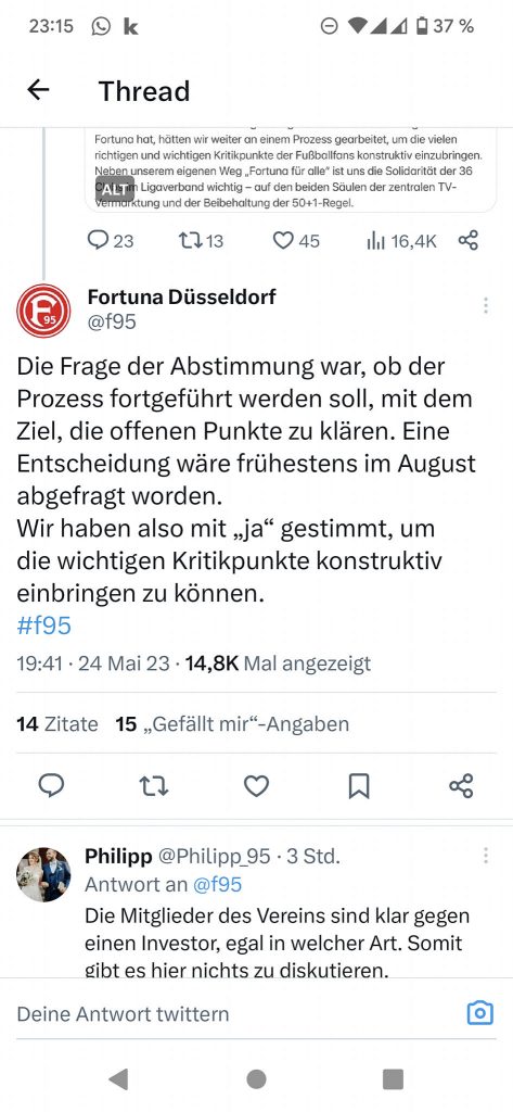 Bitte lies nochmal den Artikel. Unsere Vertreter haben NICHT dafür gestimmt weiter über Investoren nachzudenken, sondern über Möglichkeiten zur finanziellen Strukturverbesserung der DFL-Ligen. Im üblichen F95-Kommunikationschaos mussten sie einen Tweet nachschieben, der das erklärt. Schlimm genug, dass die F95-Vertreter also der These von der „Wettbewerbsfähigkeit“ der deutschen Ligen anhängen…