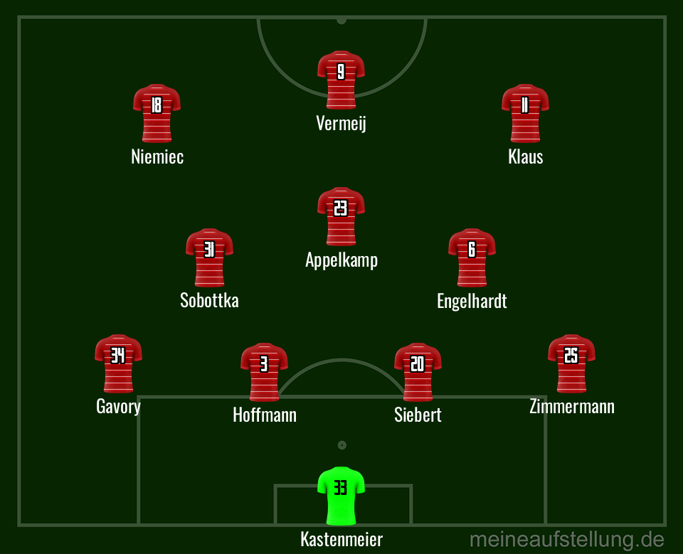 Das spricht für das erprobte 4-3-3. In der Pressekonferenz vor dem Spiel hat Trainer Thioune durchblicken lassen, dass er den Neuen, die bisher wenig ran durften, Startelfchancen geben wird. Das betrifft also vor allem Vince Vermeij, Yannik Engelhardt und Jamil Siebert; die beiden Neuverpflichtungen, also Ísak Jóhannesson und Christos Tzolis, fahren mit und werden mit hoher Wahrscheinlichkeit auch eingewechselt. Jona Niemiec zählt zwar nicht zu den Neuen, könnte aber ebenfalls schon zum Anpfiff auf der Wiese stehen. Es würde also mit nur einer Spitze losgehen: