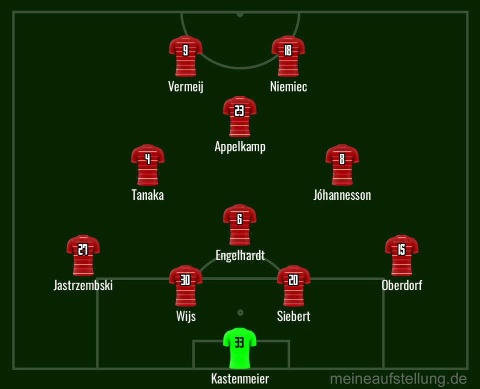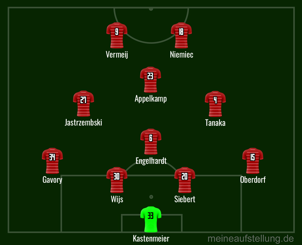 Ein solch aggressiver Spielplan könnte sogar in eine extrem offensive Aufstellung münden. Dies in einem System mit zwei Spitzen, zum Beispiel als 4-4-2 mit Raute. Upps, das hatten wir aber diese Saison noch nicht. Stimmt, aber es ist mit dem zur Verfügung stehenden Personal durchaus vorstellbar. Ganz vorne würde der Ergebene mit Vince Vermeij und Jona Niemiec starten; später könnte Daniel Ginczek einen der beiden ersetzen oder sogar als zusätzlicher Spitze kommen.