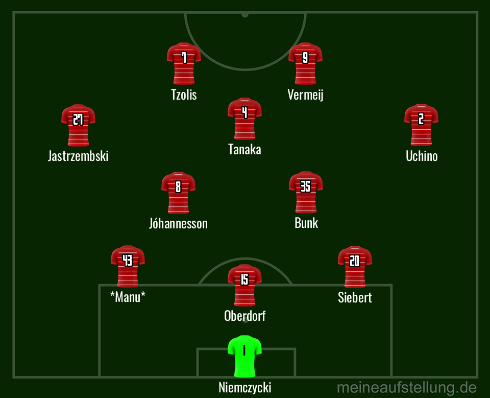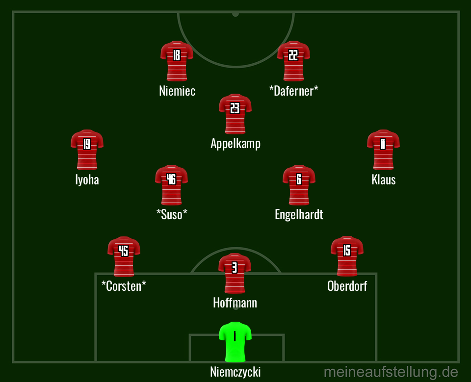 Emma Iyoha und Felix Klaus auf den Flügeln sah schon fast normal aus. Shinta Appelkamp gab einen sehr bemühten Zehner, hatte aber wenig Spielglück. Als Doppelsechs fungierten Yannik Engelhardt und Klaus Sima Suso, von dem man allerdings nicht so viel sah. Zwischendurch wurden die Positionen auch mehrfach gewechselt, sodass die abgebildete Formation nur den anfangs beobachteten Zustand darstellt.