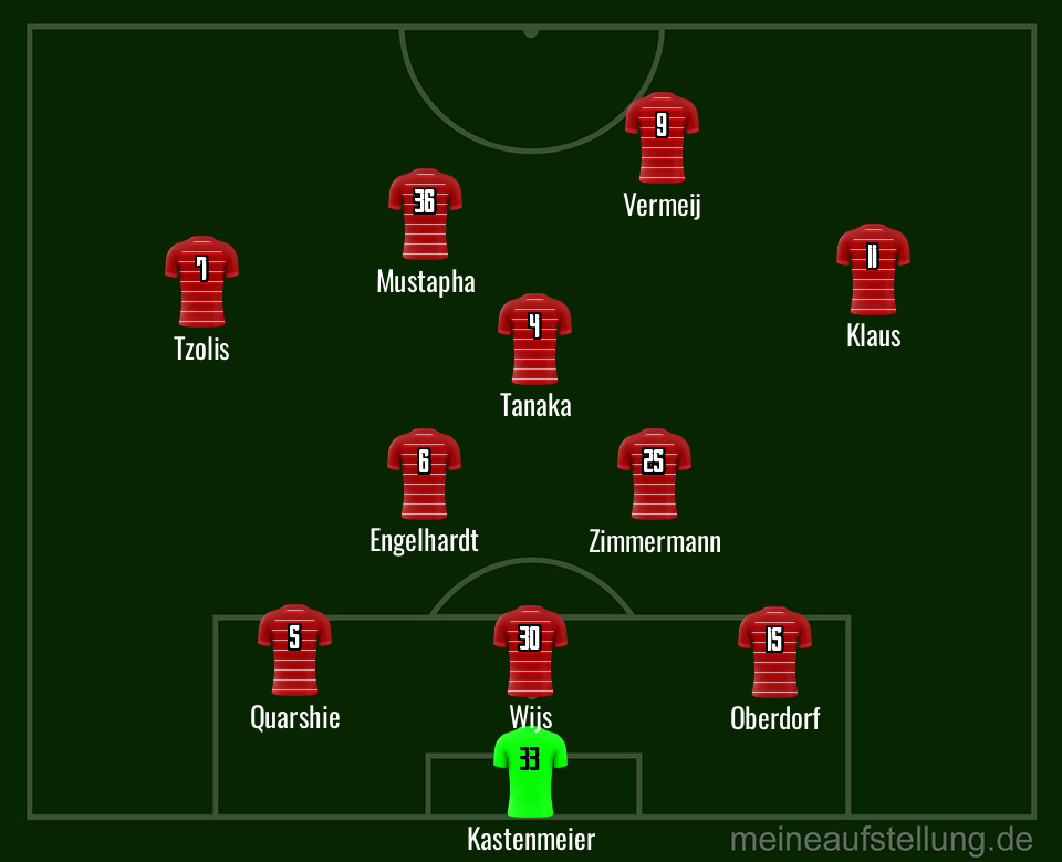 Euer Ergebener bleibt dabei: Ihm würde eine Doppelspitze mit Vermeij und Mustapha ganz gut gefallen. Und auch eine Dreierkette mit Joshua Quarshie als drittem Innenverteidiger könnte er sich vorstellen. Dann sähe die – in der Realität eher unwahrscheinliche – Aufstellung so aus: