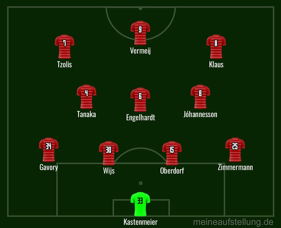 Das wäre nominell ein 3-5-2, aber in sich deutlich asymmetrisch. Auf der Bank nehmen neben den bereits genannten und Keeper Niemczycki Duffy Daferner sowie King Manu Platz.