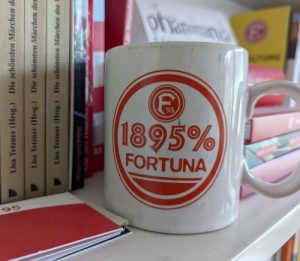 Einschub: Im Herbst 2002 bekam der Ergebene diese hässliche F95-Tasse von lieben Kollegen als Geschenk. Seitdem trinkt er an jedem Spieltag seinen Morgenkaffee aus diesem Pott. Gestern hat er es vergessen. Klar, dass die liebe Fortuna dann nicht gewinnen kann. Insofern trägt der Ergebene die Schuld an dieser Niederlage in Münster.