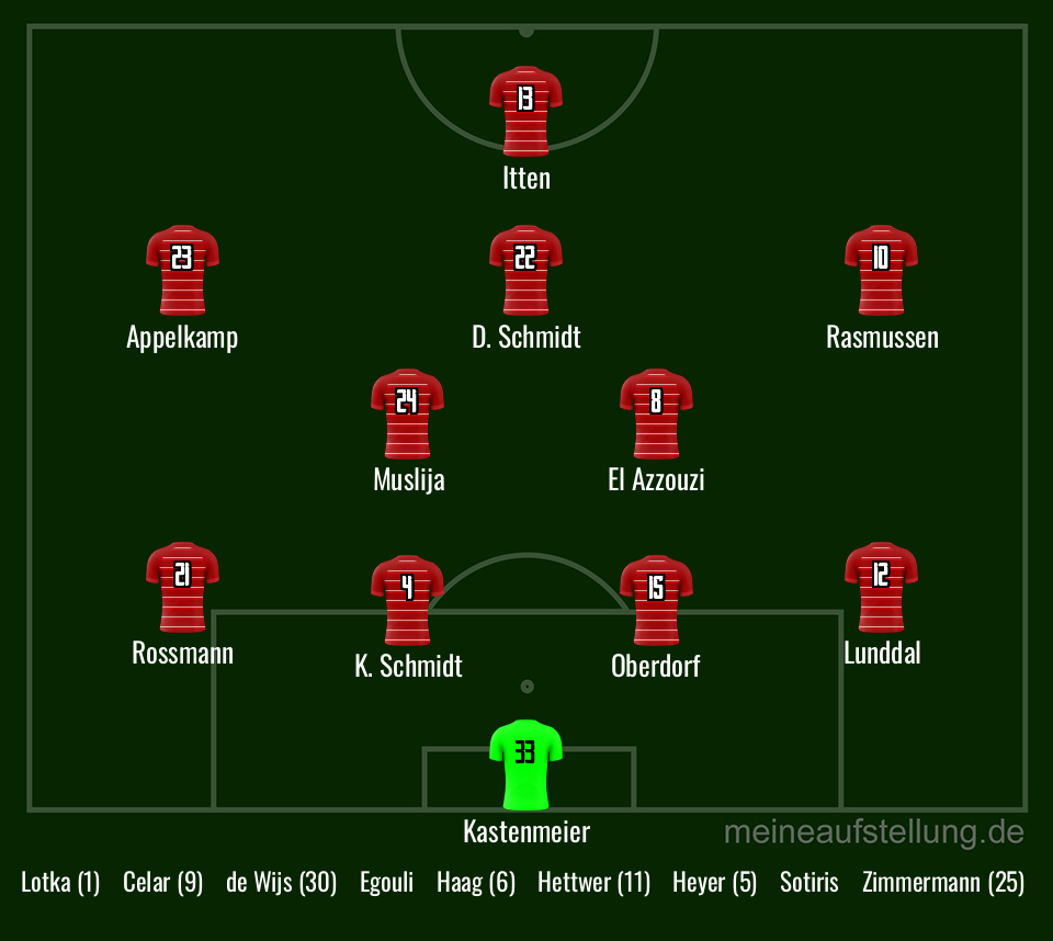 Der Ergebene wäre auch für einen programmierten Wechsel zwischen Kenny Schmidt und Eli Egouli, Reihen folge egal. Und wenn Soto auf der Bank genug Frust angesammelt und in Spielwillen umgesetzt hat, käme er für den verbliebenen Zehner, also Appelkamp oder Rossmann. Julian Hettwer für Tim Rossmann und Zimbo Zimmermann für Valli Lunddal wäre mögliche weitere Wechsel. Auf die Bank gehört zwingend Jordy de Wijs (sofern er nicht auch die Schnelle noch wegverkauft wird), der sogar als mögliche IV-Alternative in der 60. kommen könnte. Mo Heyer wäre möglicher Ersatz für El Azzouzi. Und dass Žan Celar schon auf der Bank sitzen wird, ist wahrscheinlich; vielleicht kommt er sogar für ein paar Minuten anstelle von Cedi Itten.