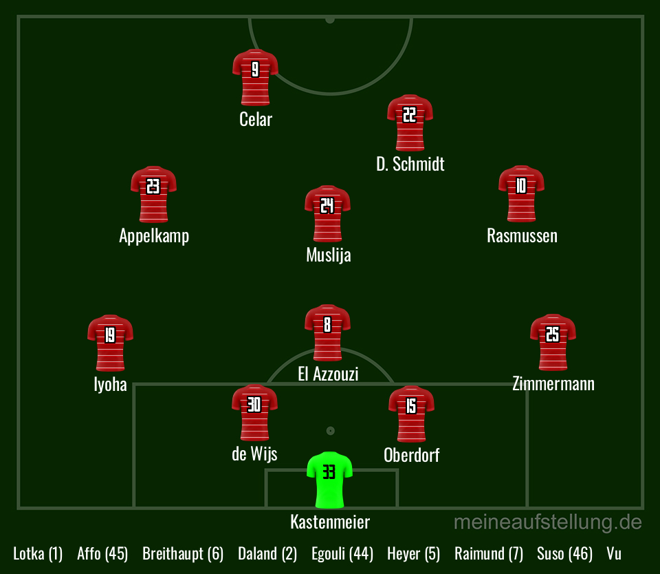 Drittens würde der Ergebene anderthalb Spitzen aufstellen, also auf jeden Fall den so oft unterschätzten Danny Schmidt sowie Czeki Celar, der seine damit seine (vor)letzte Chance bekäme. Viertens wiederholt der Ergebene sein Ceterum Censeo, dass Jordy de Wijs in die startende Viererkette gehört. Außerdem sollte Anouar El Azzouzi ausnahmsweise wieder den defensiven Sechser, Florent Muslija einen Zehner mit Narrenfreiheit spielen. Geht Shinta Appelkamp auf den linken Flügel, passt Emma Iyoha als linker AV gut dazu. Am rechten Ende der Viererkette gibt es aktuell keine Alternative zu Zimbo Zimmermann.