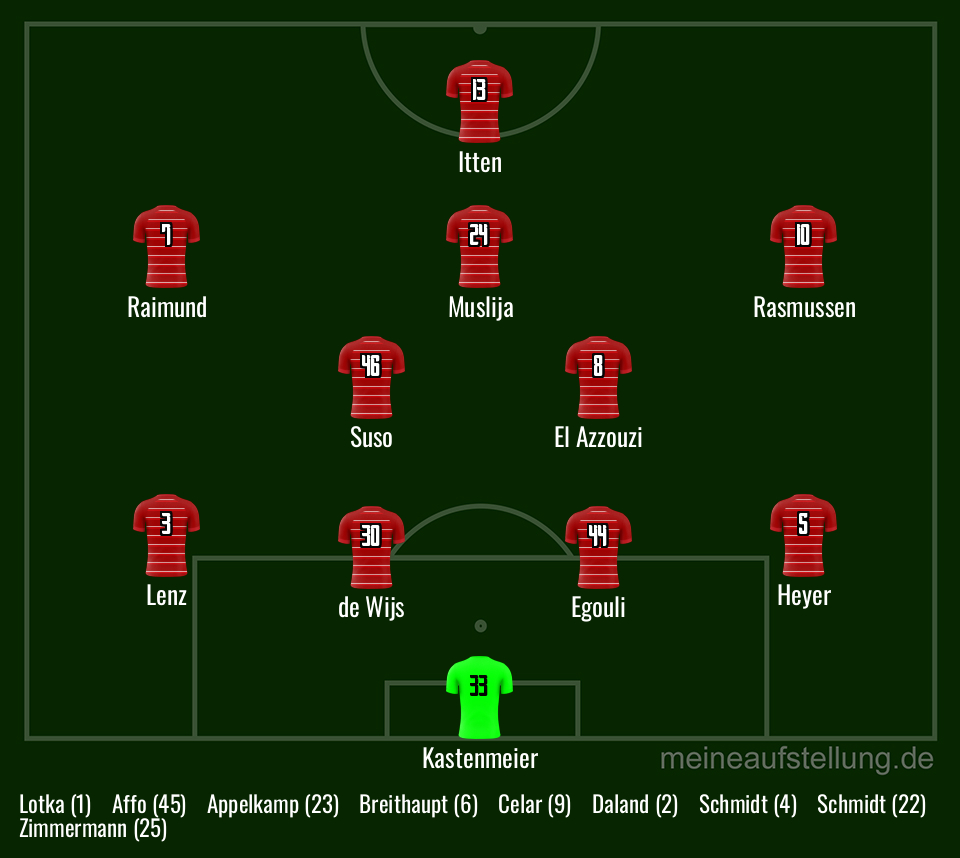 Die Kombi aus Anou El Azzouzi und Sima Suso hat dem Ergebenen gefallen, egal, wer von beiden nun einen Sechser oder einen Achter gibt. Dass Cedi Itten wieder einzige Spitze spielt, versteht sich von selbst. Trotz alle Bedenken würde euer Lieblingsanalyst mit Chris Rasmussen auf der rechten Seite beginnen. Wegen mangelnder Effizienz bliebe Emma Iyoha draußen. Auf seiner Seite könnte doch auch mal Luca Raimund antreten. Bleibt die Frage nach dem Zehner. Der Auftritt von Mukki Muslija gegen Schalke war wenig überzeugend, der aber trotzdem starten könnte, um später durch Shinta Appelkamp ersetzt zu werden.