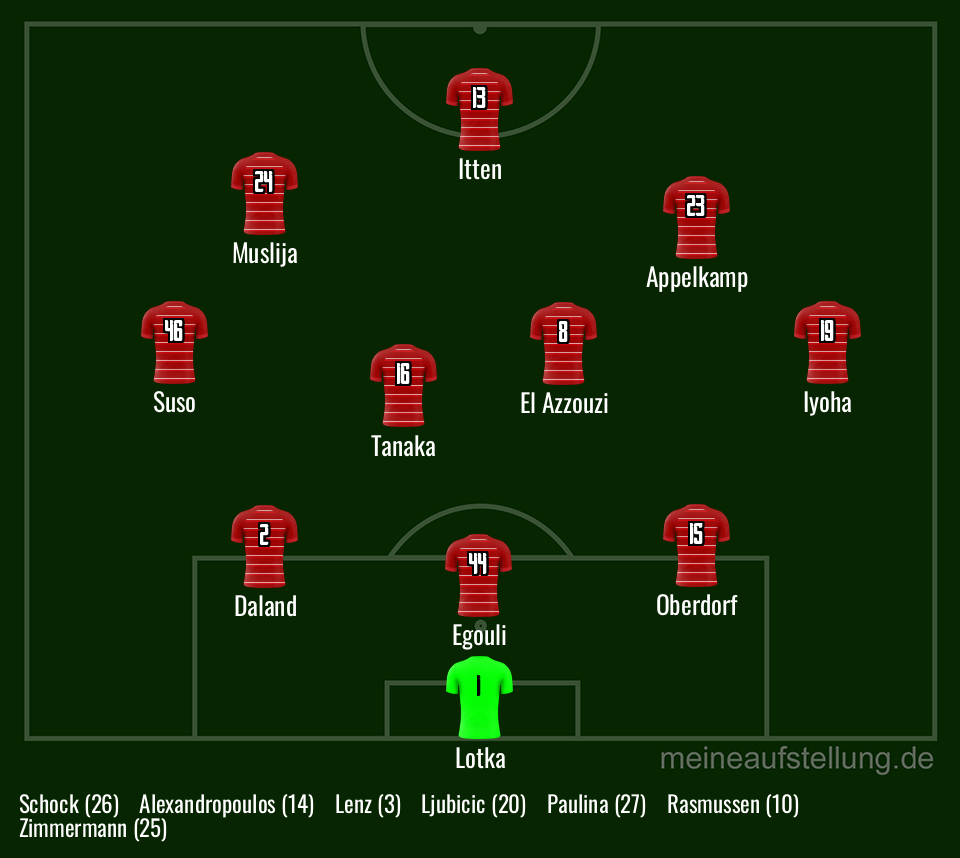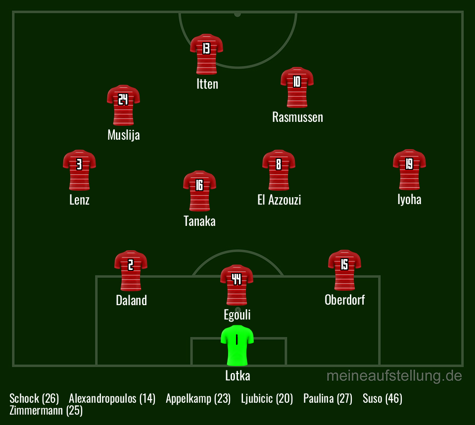 Denn Christopher „der Lenzer“ Lenz ist wieder dabei, Florent „Mukki“ Muslija ist fit und auch das Umknicken von Chris Rasmussen hat keine Spuren hinterlassen. Und dann wäre dann auch noch Emma Iyoha und Shinta Appelkamp, die sich für einen Platz im nördlichen Bereich bewerben. Vieles spricht dafür, den mit aufsteigender Form versehenen Emma wieder auf die rechte Schiene zu setzen und dem Lenzer die andere Seite zuzuordnen. Offensiver wird’s, wenn Rasmussen eine rechtslastige und hängende Spitze spielt, zurückhaltender, wenn Shinta Appelkamp stattdessen einen Halbstürmer mimt. Muslija würde in jedem Fall links, aber vermutlich so weit vorne wie zuletzt antreten. Hier die Version mit Rasmussen statt Appelkamp: